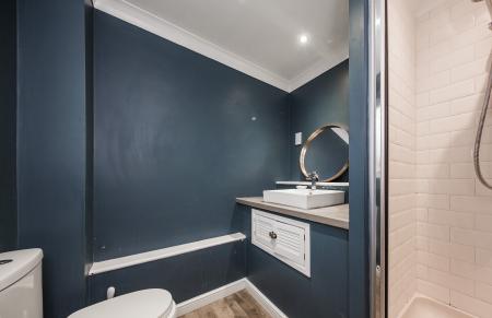EN SUITE SHOWER ROOM: Fully tiled enclosure with wall mounted shower unit, low level wc and wash basin. Heated chrome towel rail, laminate flooring and obscured window to front.