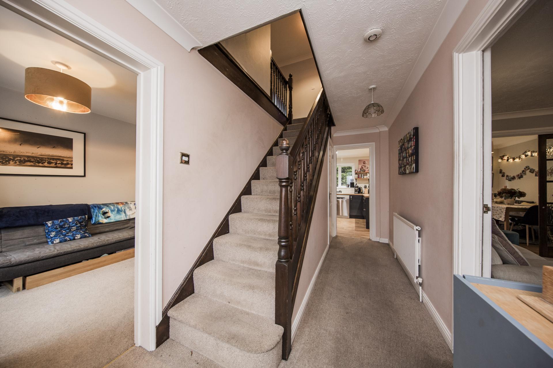 Situated in a highly sought-after cul-de-sac on the southern side of Crowborough, this well-presented and spacious four-bedroom detached home offers excellent access to the town centre and a selection of local schools. The well-appointed accommodation comprises, in brief, an entrance hall, downstairs cloakroom, a generous family room, a large sitting room with a feature fireplace, and a modern kitchen/dining room with direct access to the rear garden, complemented by a separate utility room. On the first floor, the main bedroom includes extensive fitted wardrobes with matching furniture and a stylish en suite shower room. Three further bedrooms are served by a family bathroom. Outside, the property features a private brick-paved driveway providing off-road parking to the front, and a delightful rear garden backing onto woodland.