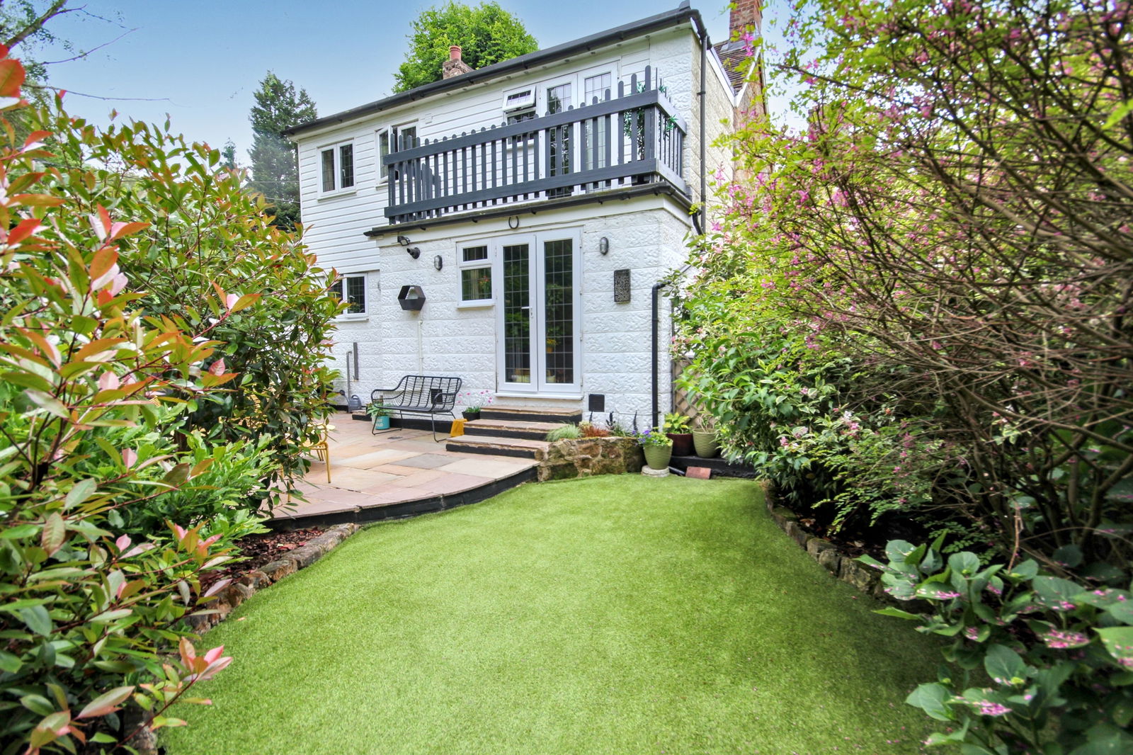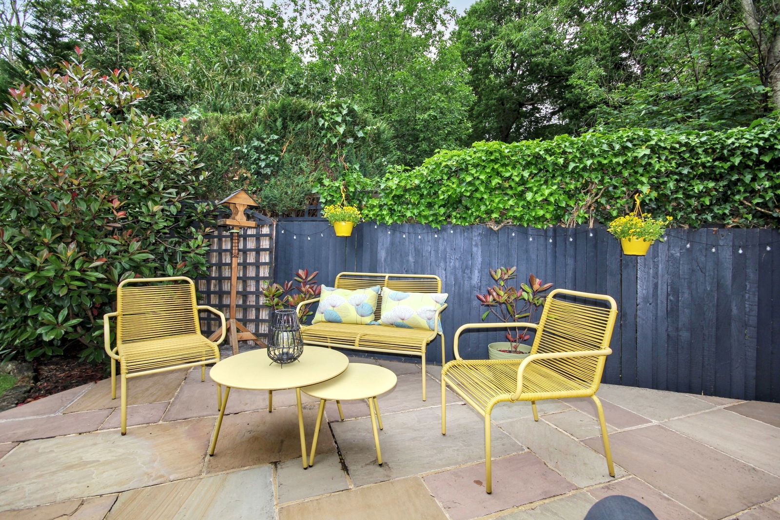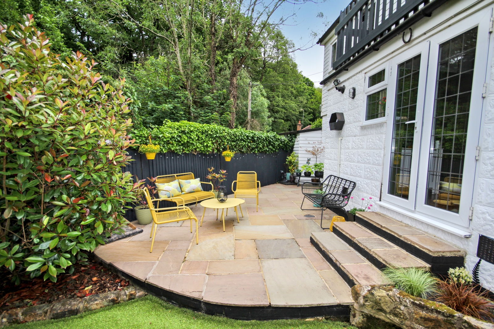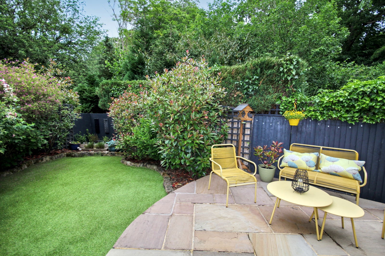 OUTSIDE REAR: The garden benefits from ancient woodland views and includes a sandstone patio and an area laid to artificial grass. In addition are raised flower bed borders with a selection of mature shrubs and plants, outdoor tap and lighting, all enclosed by fence boundaries.