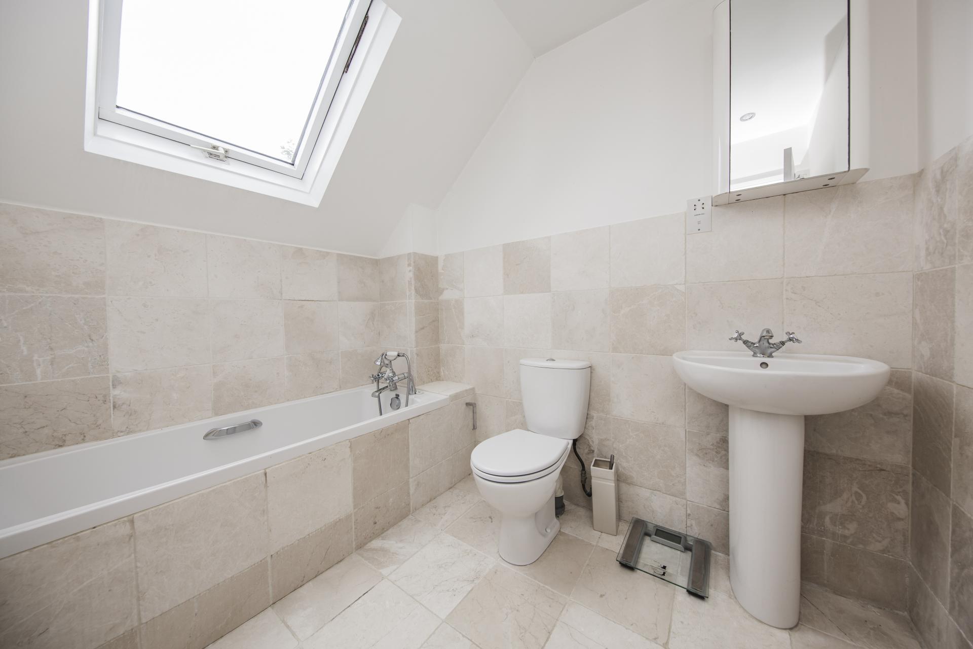 FAMILY BATHROOM: Tiled panelled bath with shower attachment over, tiled cubicle with integrated shower, dual flush low level wc, vanity wash hand basin with storage under, chrome heated towel rail and a roof window.