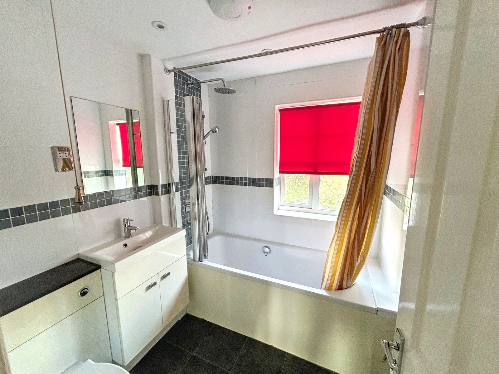 FAMILY BATHROOM: Panelled bath with shower over and further handheld shower attachment, dual flush low level wc, vanity wash hand basin with storage, mirrored wall, chrome heated towel rail, tiled flooring, extractor fan and obscured window to side.