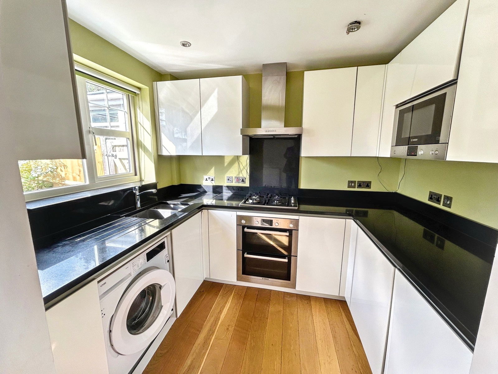KITCHEN: Range of wall and base units with granite worktops over incorporating a one and half bowl stainless steel sink, double oven with 4-ring gas hob and extractor fan, integrated microwave, integrated washing machine, wall mounted gas Potterton boiler and window to rear.