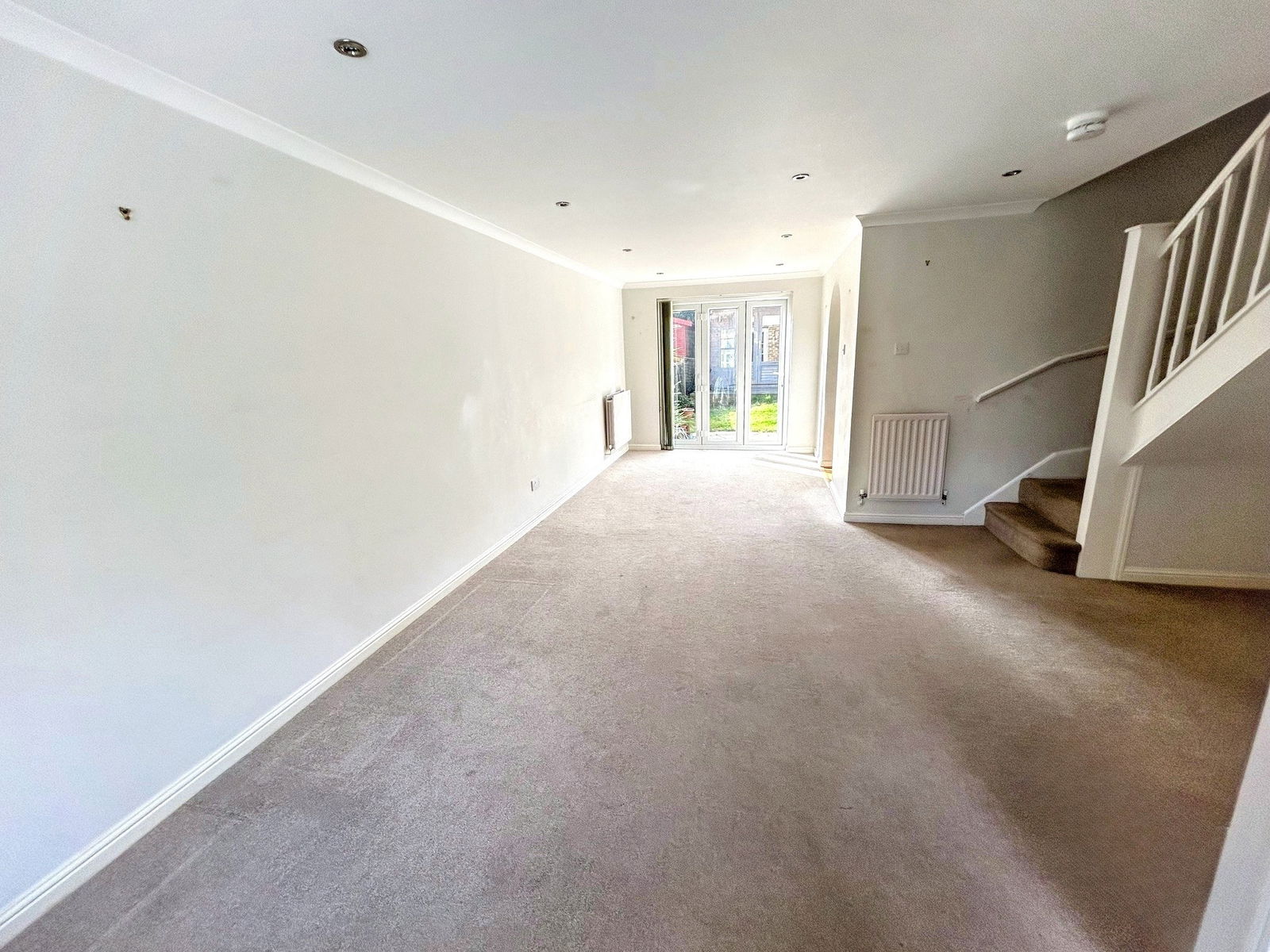 SITTING/DINING ROOM: Space for sofa seating and dining furniture, stairs to first floor with recess area, fitted carpet, radiator, box bay window to front and doors opening to rear patio and garden.