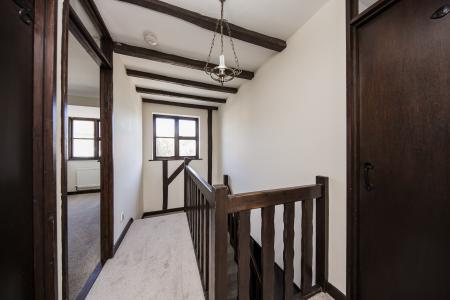 FIRST FLOOR LANDING: Recently fitted carpet, beamed ceiling and walling, large loft hatch, smoke alarm and window to the front.