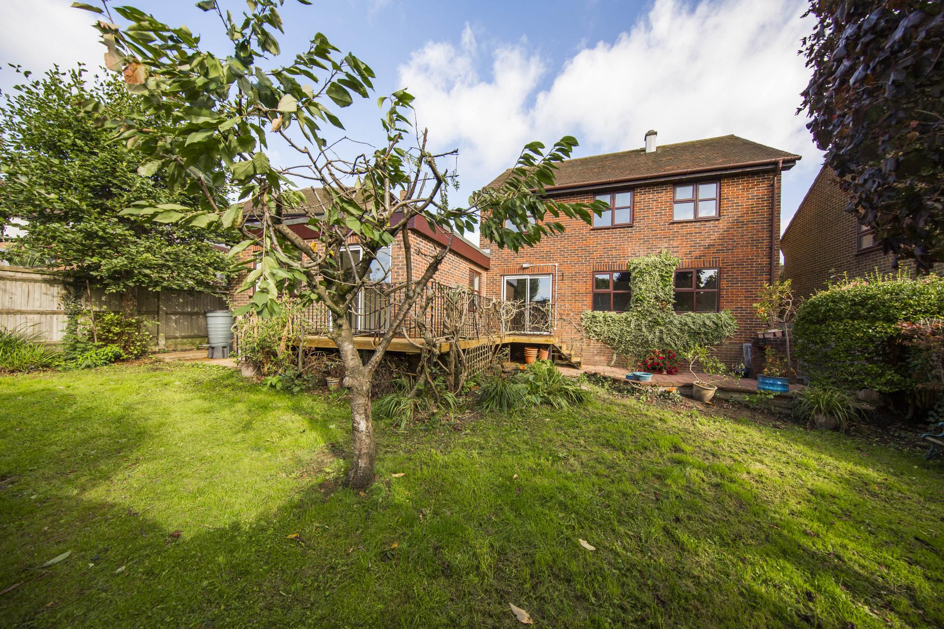 OUTSIDE FRONT: A low maintenance area of garden which is mainly laid to lawn with raised flower bed borders enclosed by Sussex Stone surrounds, mature trees and shrubs and a concrete drive provides off-road parking and access to the double garage. A wooden gate to the side gives access to the rear garden.