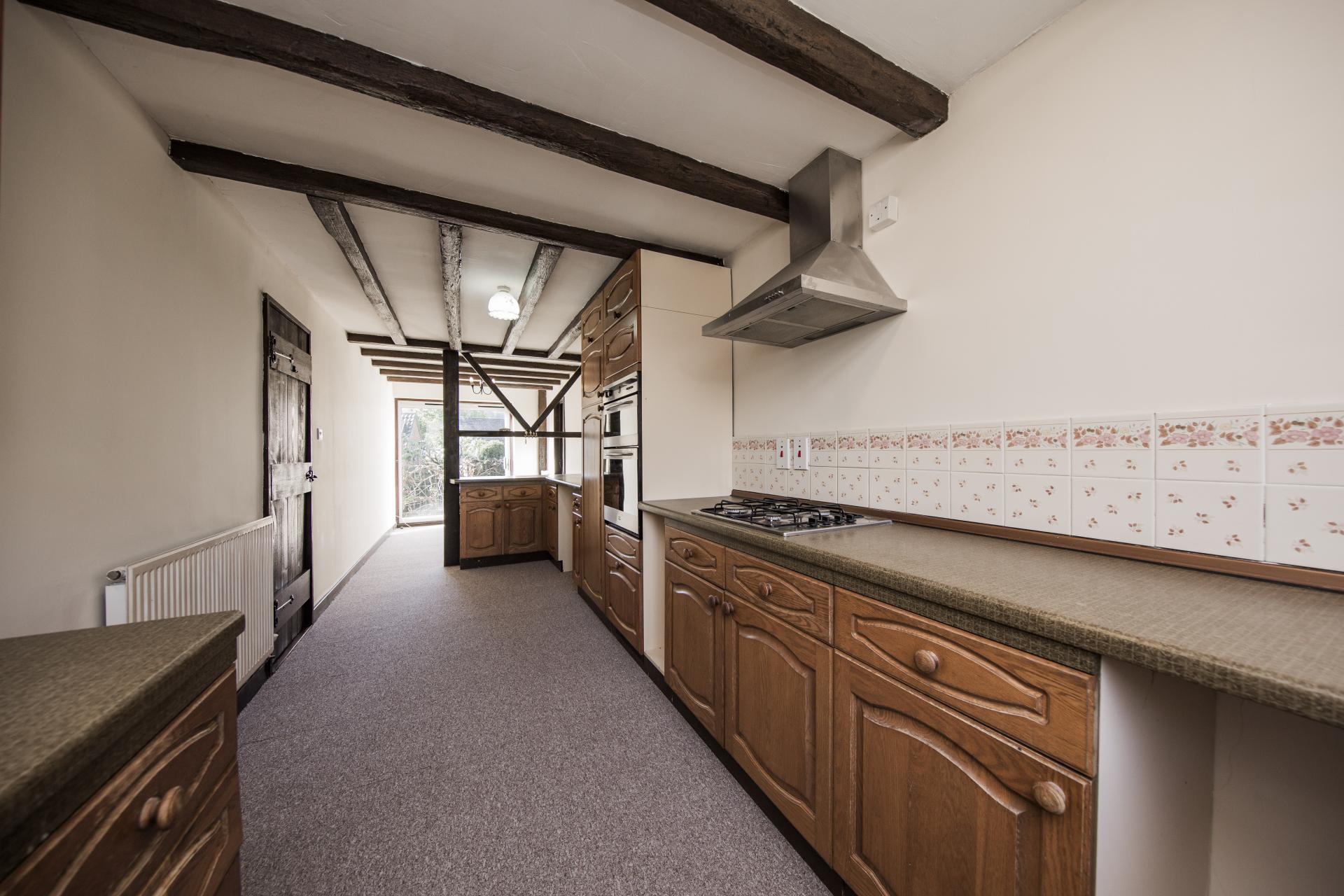 Range of traditional style high and low level units with work surfaces over incorporating a stainless steel sink. Appliances include a fan assisted oven with grill above, four ring gas hob with extractor fan above and spaces for a dishwasher, fridge/freezer, washing machine and tumble dryer. Wall mounted Vaillant boiler, radiator, recently laid wall tiling, beamed ceiling and window to front.