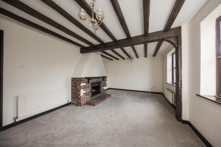 SITTING ROOM: Open fireplace with brick cheeks, brick hearth and wooden mantle over, beamed ceiling, recently fitted carpet, two radiators and two windows overlooking the rear garden.