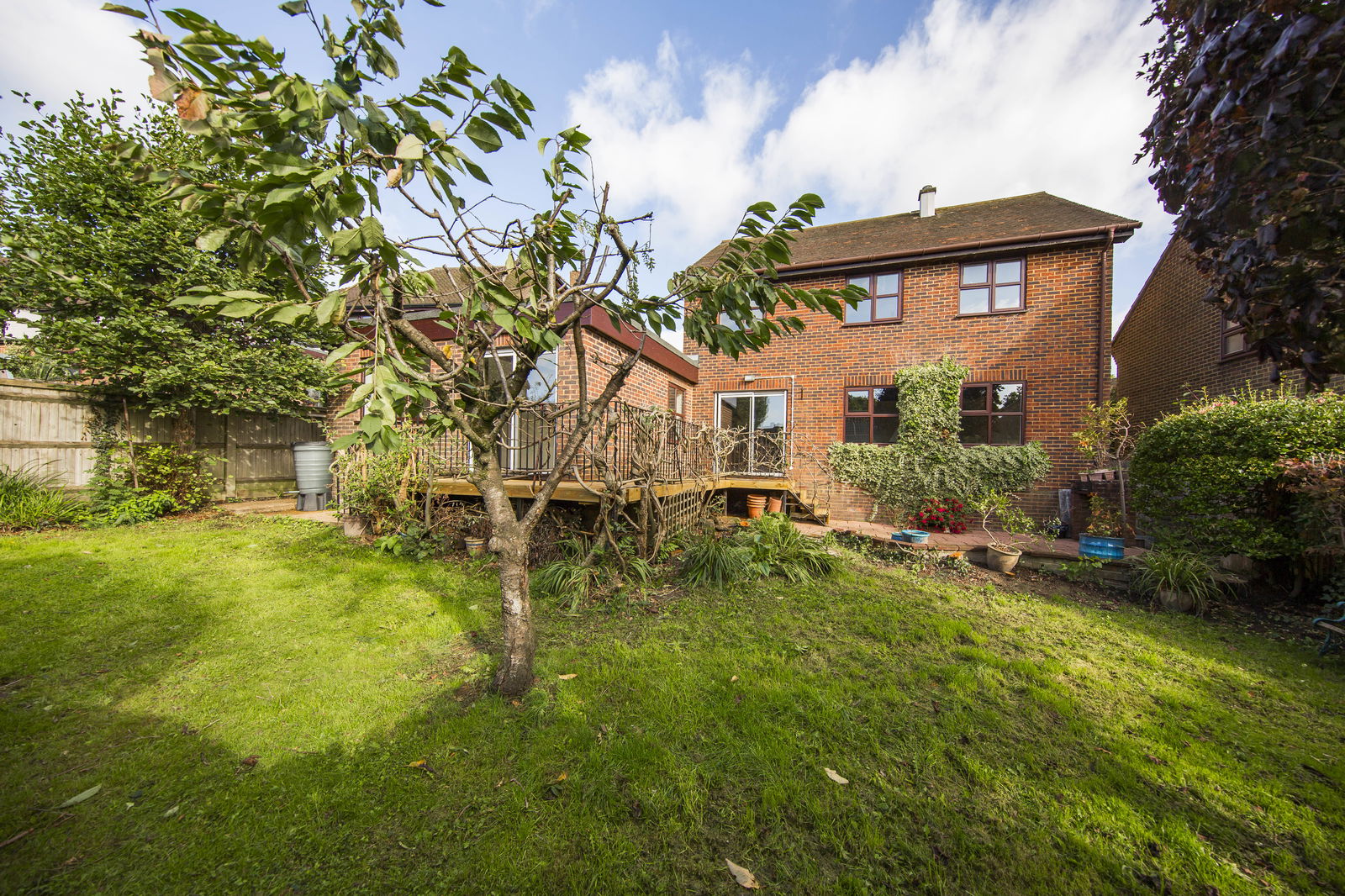 OUTSIDE REAR: A recently replaced terrace enclosed by a wrought iron balustrade leads to a paved patio, with the rest of the garden predominantly laid to lawn and enhanced by a beautiful wisteria and a mature variety of shrubs and trees.