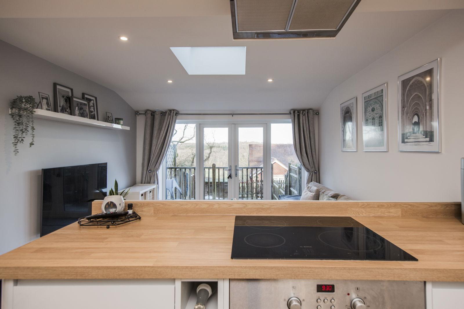 SITTING ROOM: Carpeted, radiator, skylight and double patio doors open onto rear decking area and garden beyond.