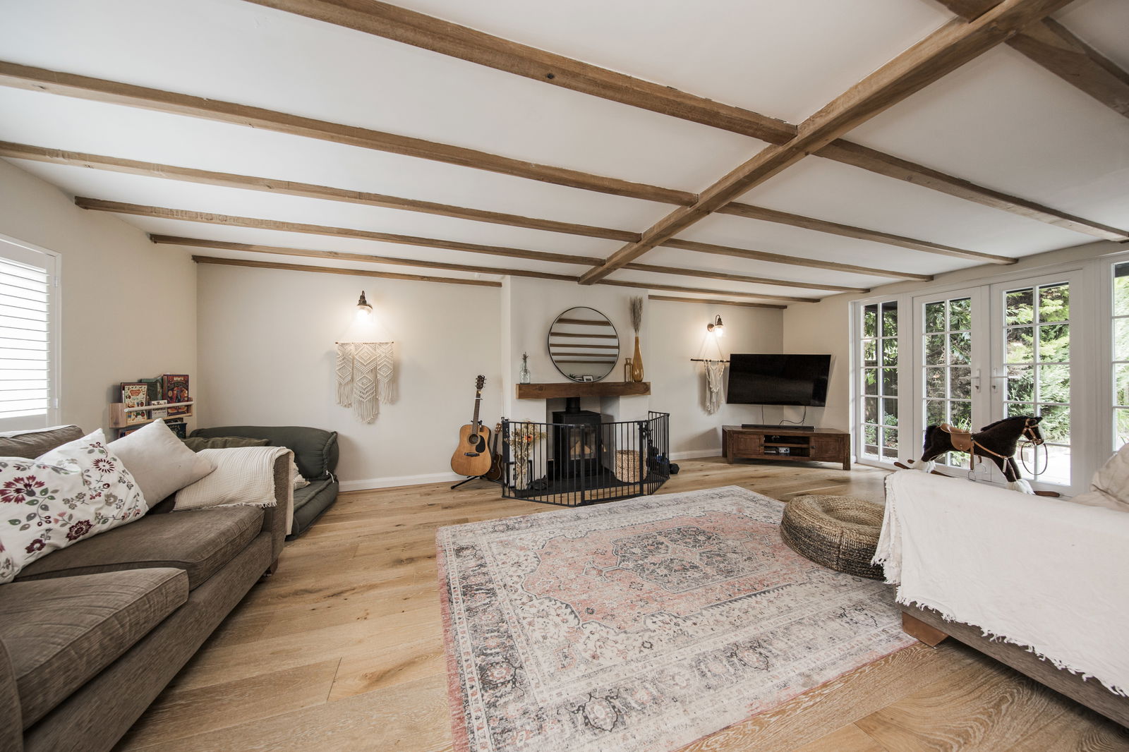 SITTING ROOM: Fireplace with log burner, slate hearth and wooden mantle over, engineered oak flooring, large radiator, wall lighting and dual aspect with window to front with fitted plantation blinds and double doors opening to rear patio.
