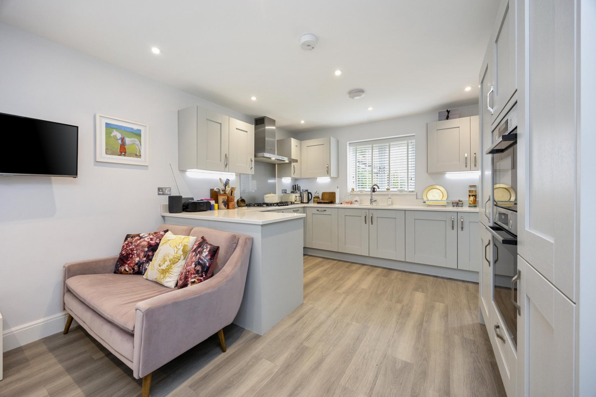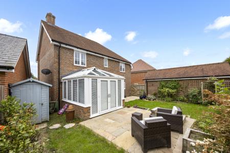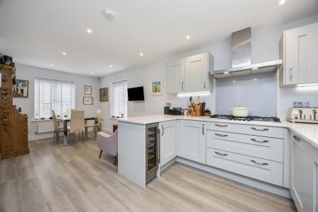 Offered to the market chain free is this modern detached family home built only five years ago and located in a tucked away cul-de-sac within a quiet residential development. Upon entering, you are welcomed by a spacious hallway, featuring a downstairs cloakroom and a large storage cupboard. The generous sitting/dining room offers ample space for both dining and relaxing, with French doors opening into a recently installed conservatory, which leads out onto an attractive Indian sandstone terrace. The stylish, triple-aspect shaker-style kitchen is fitted with a range of integrated appliances and opens into a versatile breakfast/family area, with convenient access to a separate utility room. Upstairs, there are four well-proportioned bedrooms. The main bedroom benefits from a modern en suite shower room, while a contemporary family bathroom serves the remaining bedrooms. To the front, the property offers a low-maintenance garden, off-road parking, and access to a large garage. The rear garden has been thoughtfully landscaped featuring a wide variety of planting and a recently added Indian sandstone terrace, perfect for outdoor entertaining.