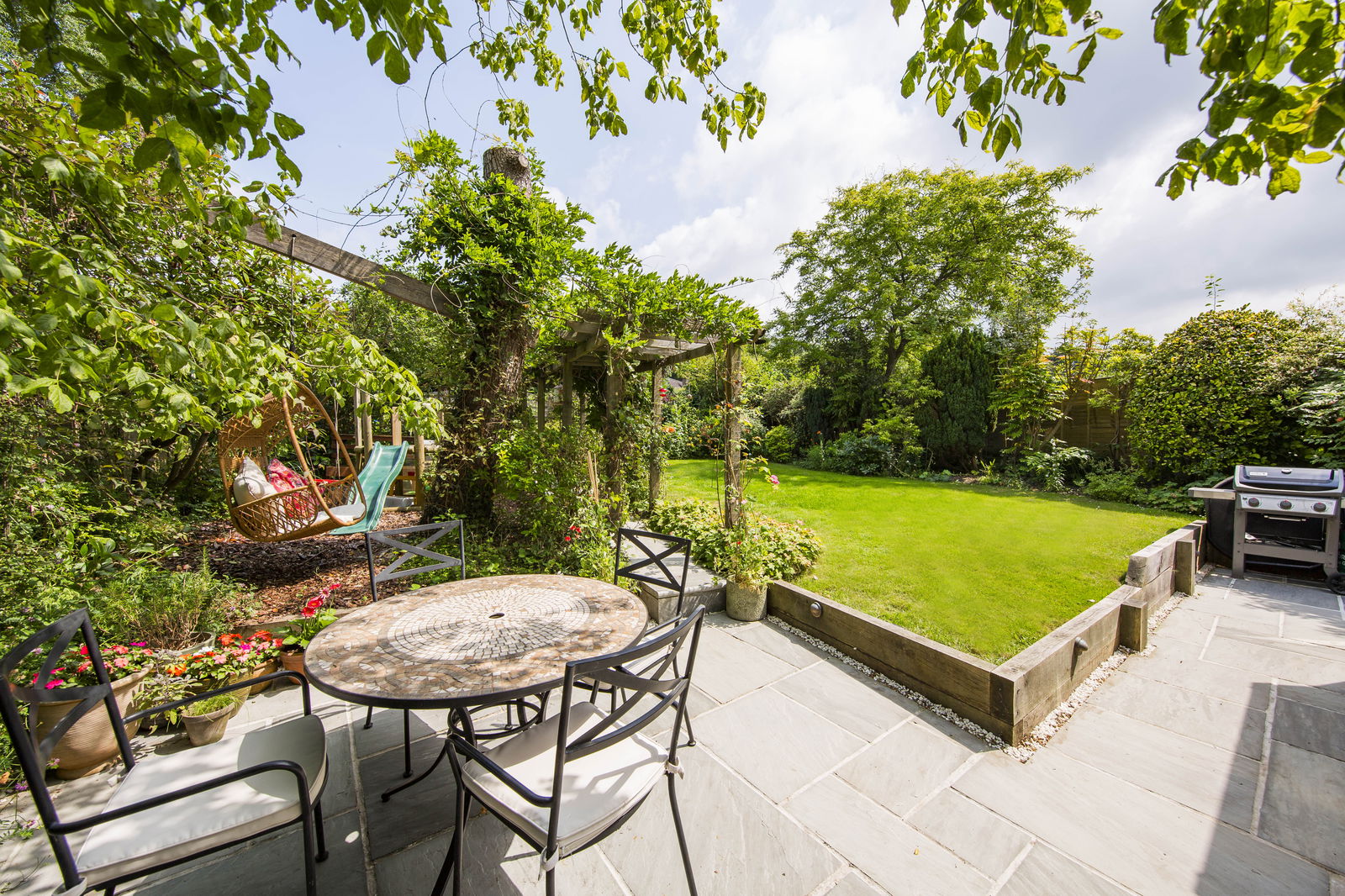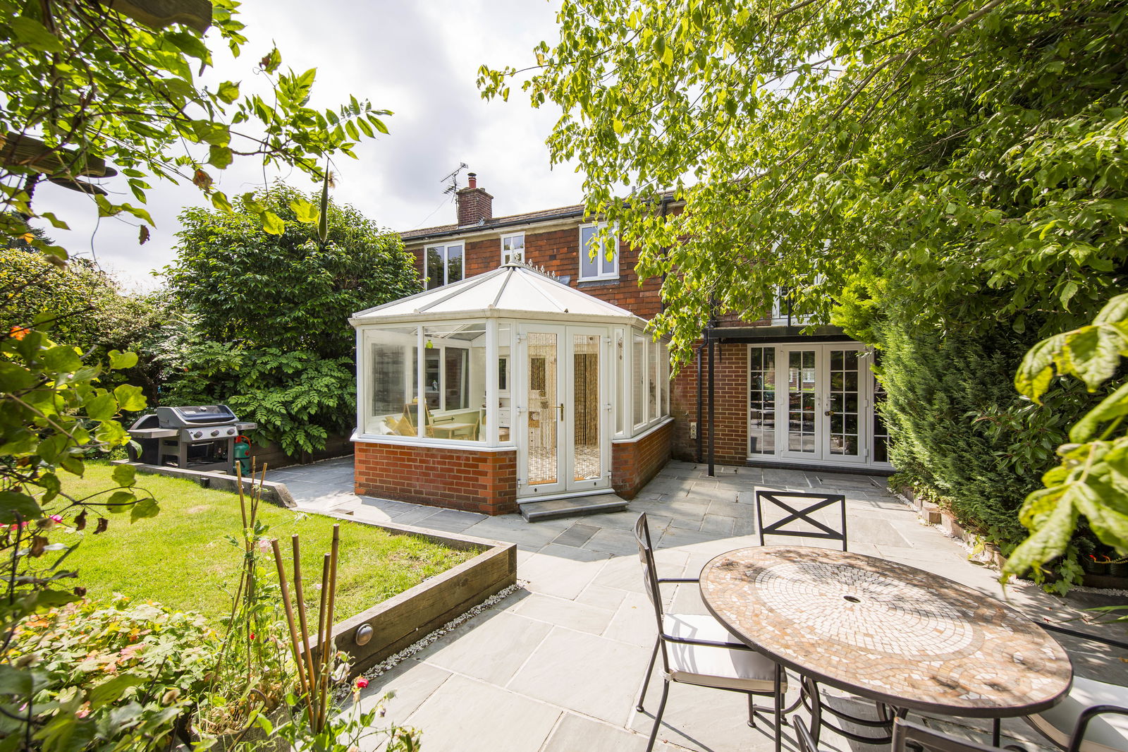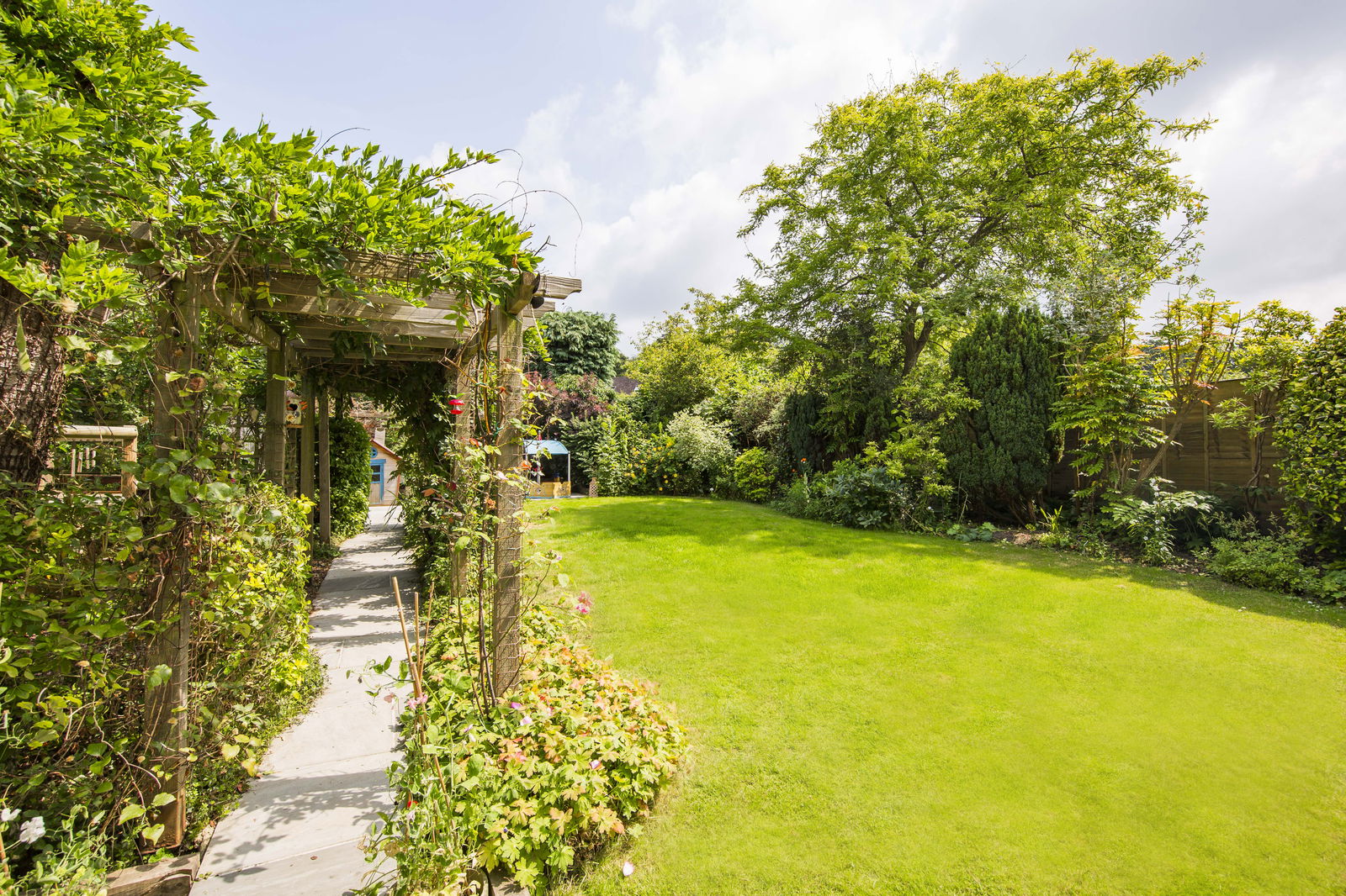 OUTSIDE REAR: Recently landscaped the garden features an Indian sandstone tiled paved patio area with space for garden table and chairs and side access. The remainder of the garden is principally laid to lawn enclosed by a selection of flower beds and established planting. A paved path with wooden trellis leads to a further Indian sandstone paved patio, a garden shed and vegetable patch.