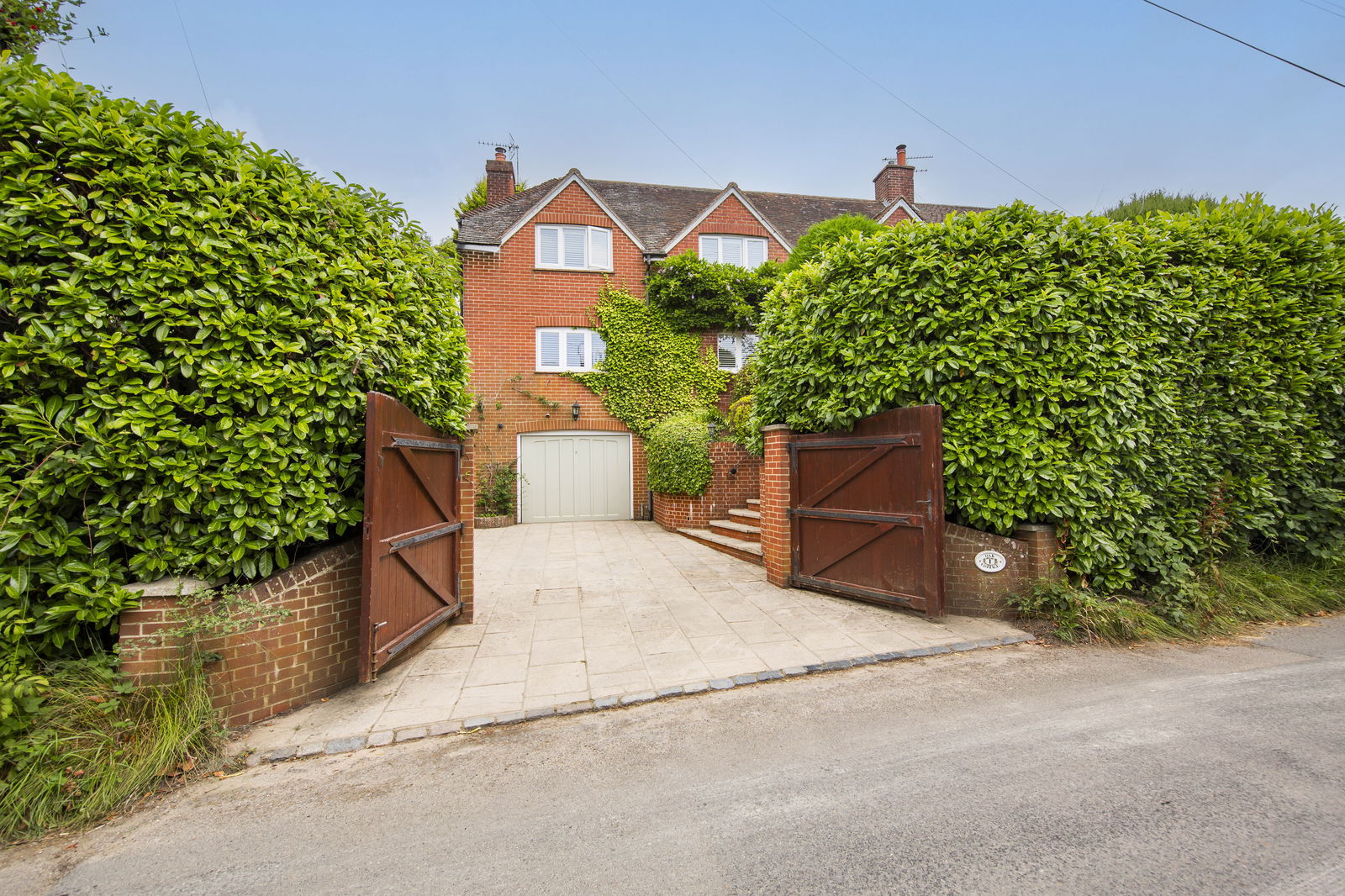 OUTSIDE FRONT: Timber gates open to an area for off road parking and a garage accessed via an electric door. Steps then rise to an area of garden with areas of mature planting and a pond. Steps with side access to rear garden.