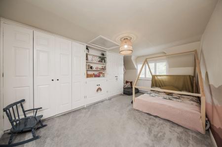 BEDROOM: Built-in extensive range of wardrobes, hatch with ladder to part boarded loft, fitted carpet, radiator and window to front with fitted plantation blinds.
