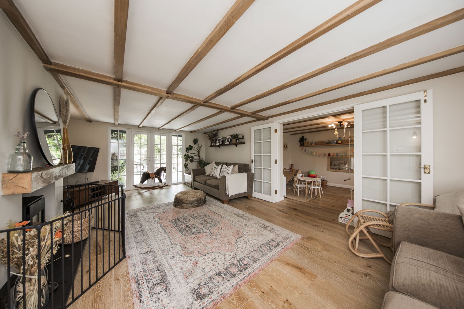 PLAY ROOM: Engineered oak flooring, radiator, window to front with fitted plantation blinds and double doors opening into: