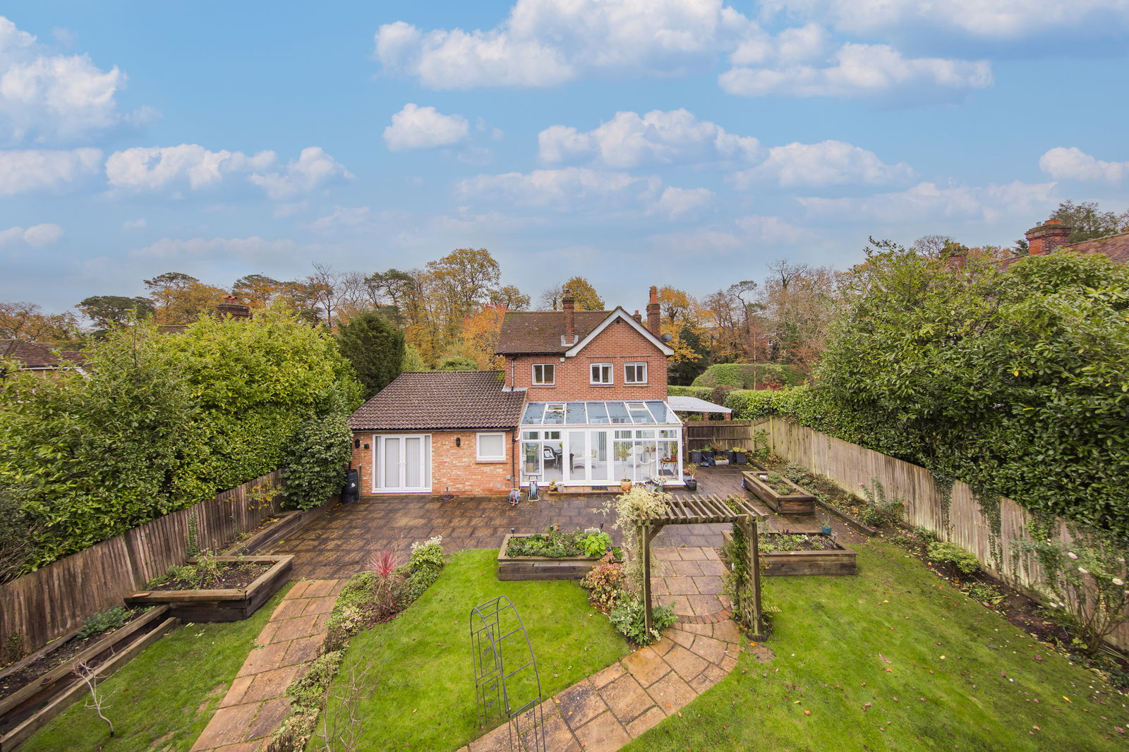 The westerly facing rear garden benefits from a large patio adjacent to the property with the remainder of the garden being principally laid to lawn. In addition is an attractive Arbor, raised beds, compost area and a selection of trees.