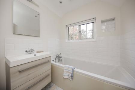 Integrated shower unit, dual flush low level wc, vanity sink with storage under, shaver point, mirrored wall, chrome heated towel rail, flooring and obscured window to front.
