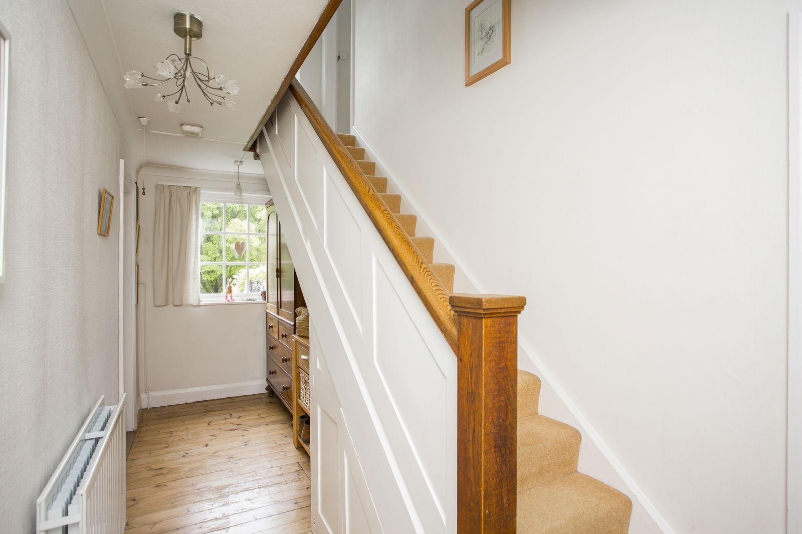 Stairs to first floor, two radiators, carpet as fitted, fire door connecting to main house and window to front.