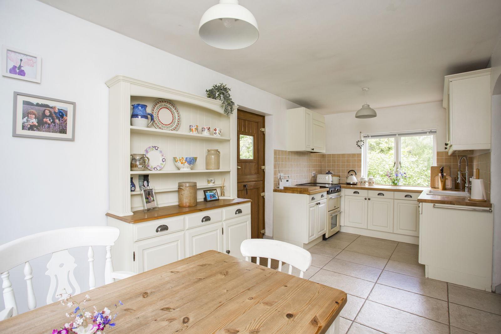 KITCHEN/BREAKFAST ROOM: An attractive country style kitchen featuring a range of wall and base units with wooden worktops and tiled splashbacks over, ceramic sink with mixer tap and vegetable washer and a inset ceramic top oven. Tiled flooring, radiator, windows to front and rear and stable door opening to the side of the property.