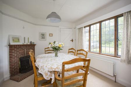 DINING ROOM: Feature fireplace incorporating a gas flame effect fire with wood mantle, brick surround and hearth, carpet as fitted and window to front.