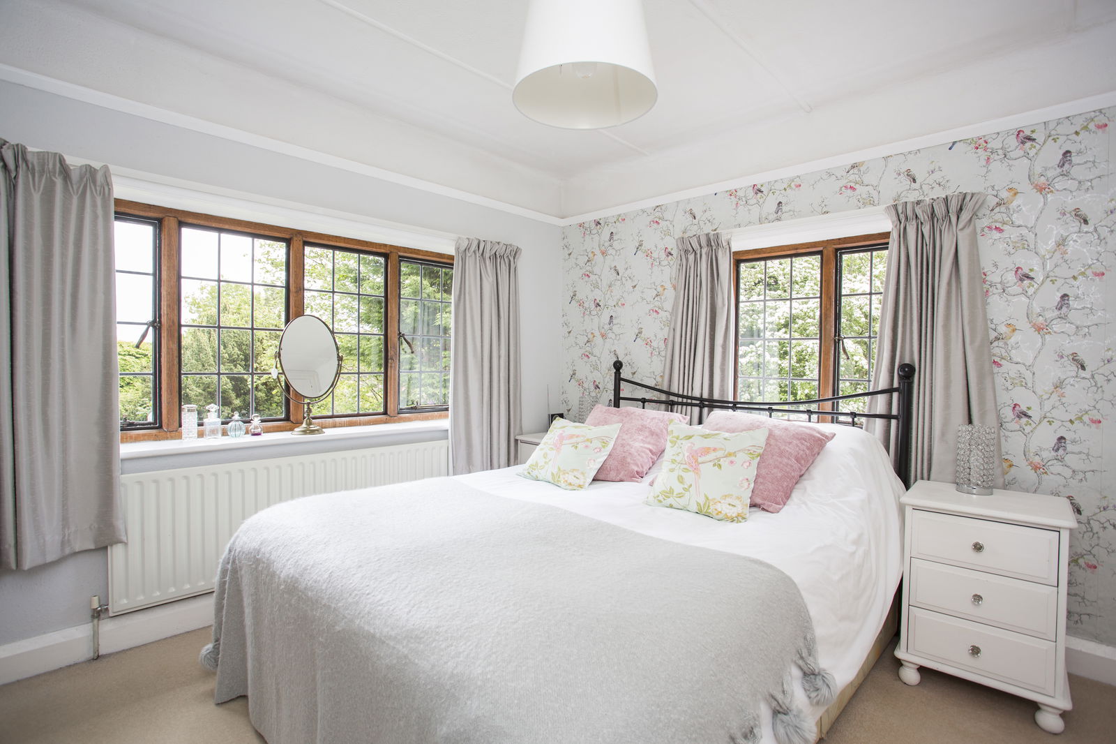 BEDROOM: A dual aspect room featuring built-in wardrobe cupboards with storage above, radiator and windows to front and side.