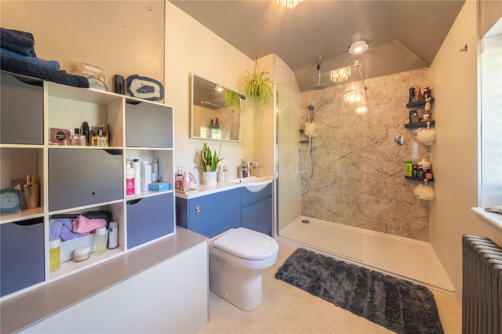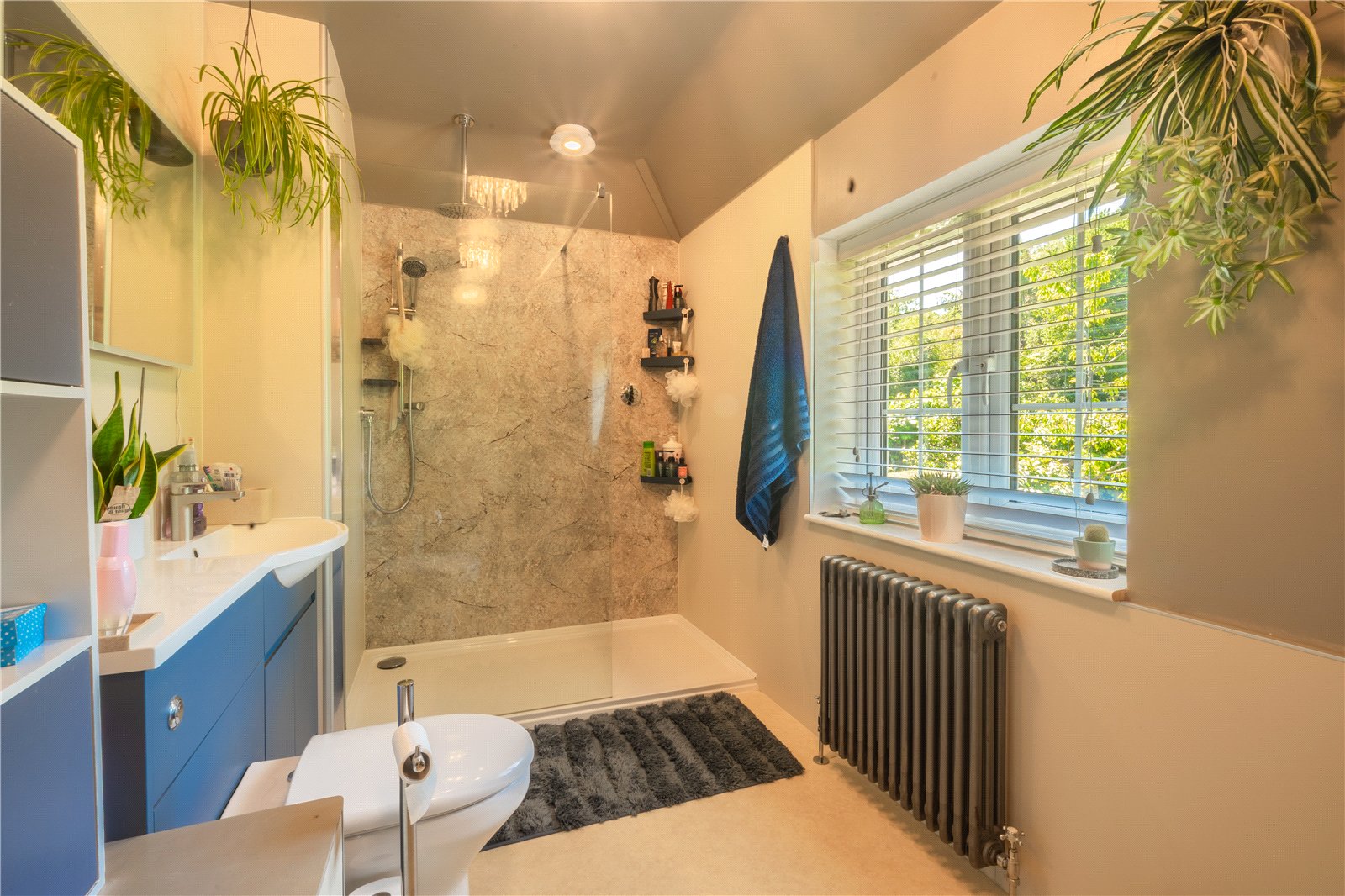 FAMILY BATHROOM: This stylish and contemporary family bathroom is beautifully appointed with a large walk-in rainfall shower set against a striking marble-effect wall panel. A sleek vanity unit with integrated basin and storage complements the modern aesthetic, while a statement mirror and overhead lighting enhance the feeling of space. The room is filled with natural light from a wide window, framed by fitted blinds and overlooking leafy greenery. Decorative shelving, a traditional-style radiator, and soft, neutral tones complete this inviting and functional space.
