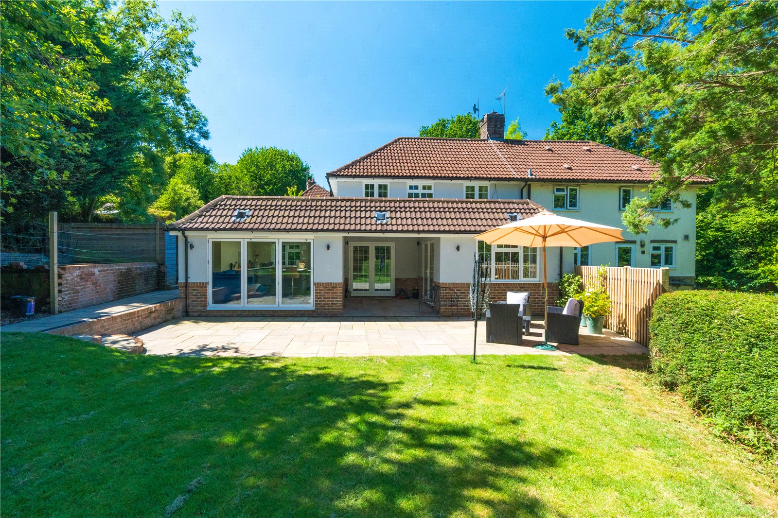 • Large, private rear garden with sandstone terrace, level lawn, and summerhouse