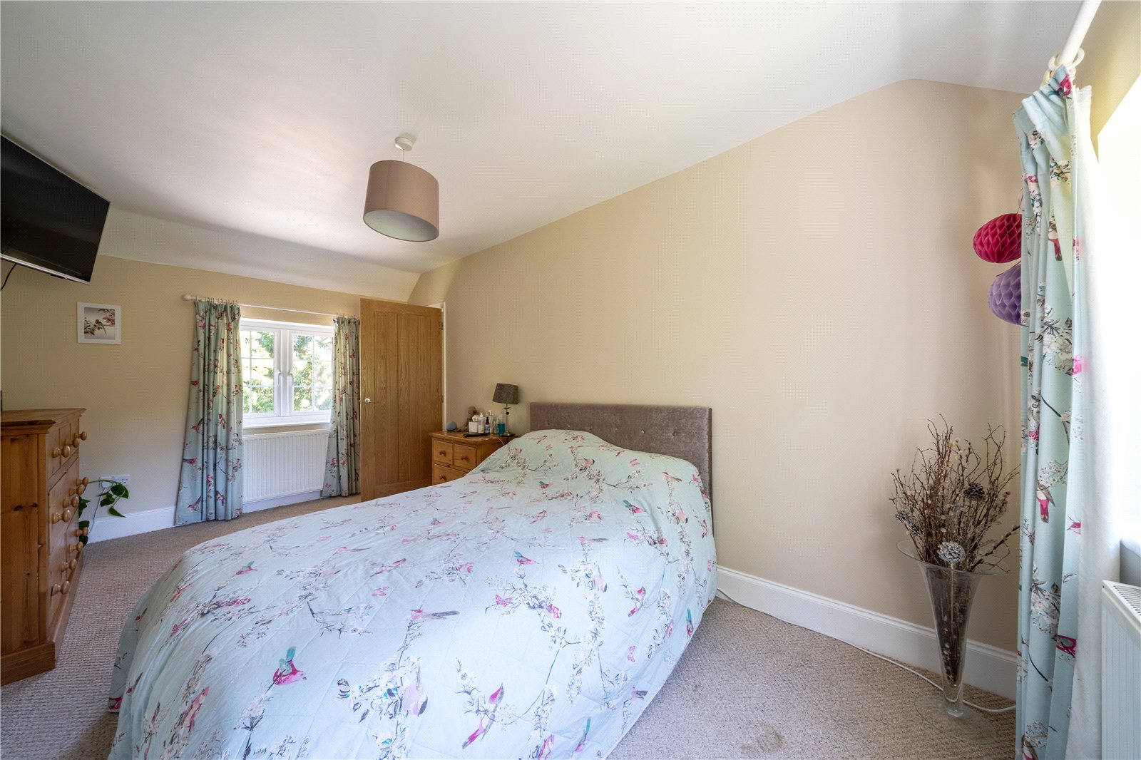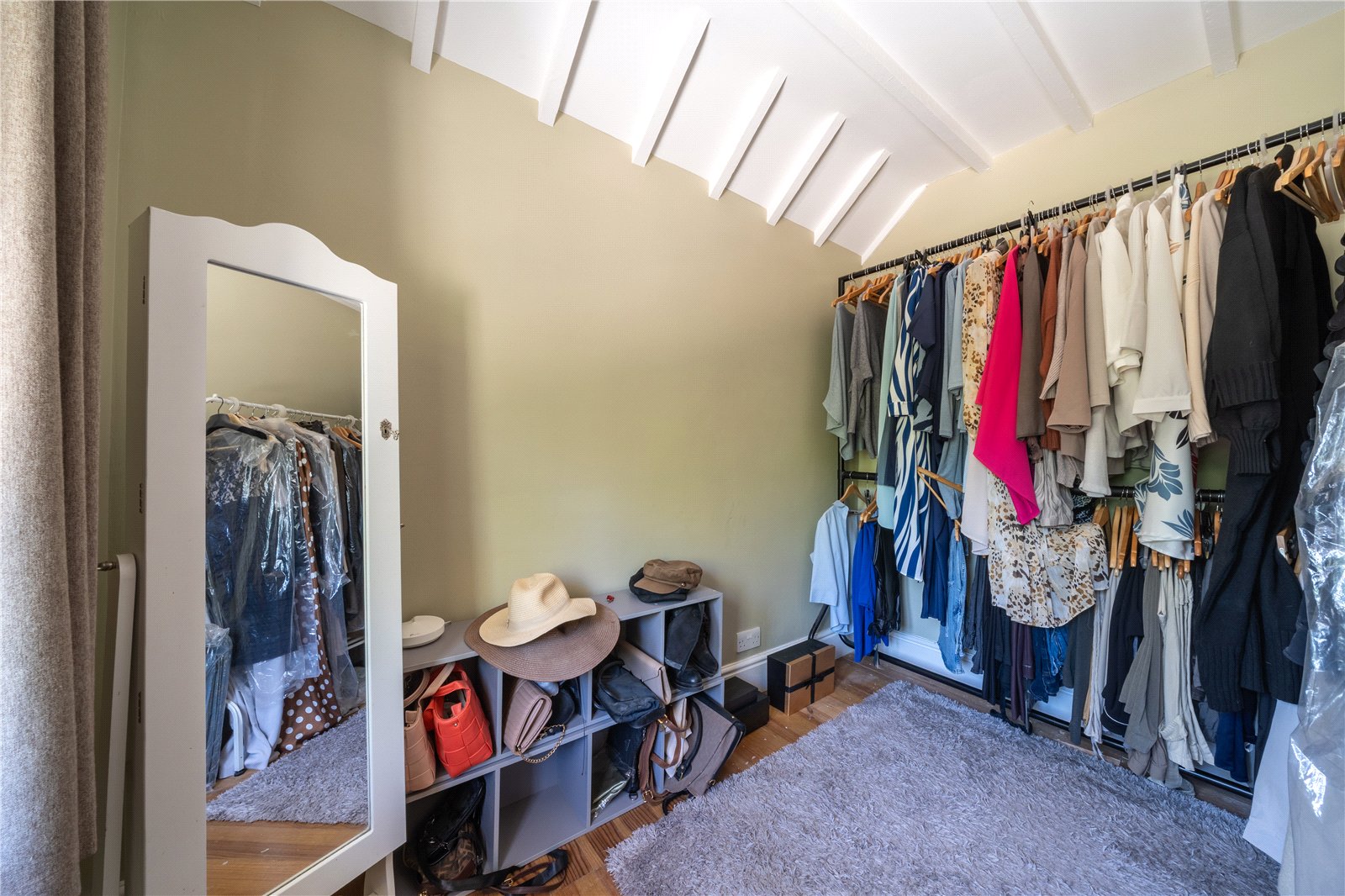 BEDROOM 2: Currently arranged as a generous dressing room, this versatile bedroom offers excellent proportions and a bright, airy atmosphere. A high vaulted ceiling with exposed beams adds architectural interest, while the large window provides plenty of natural light. With ample space for wardrobes, shelving, and storage, it would work equally well as a comfortable single bedroom, nursery, or dedicated home office depending on individual needs.