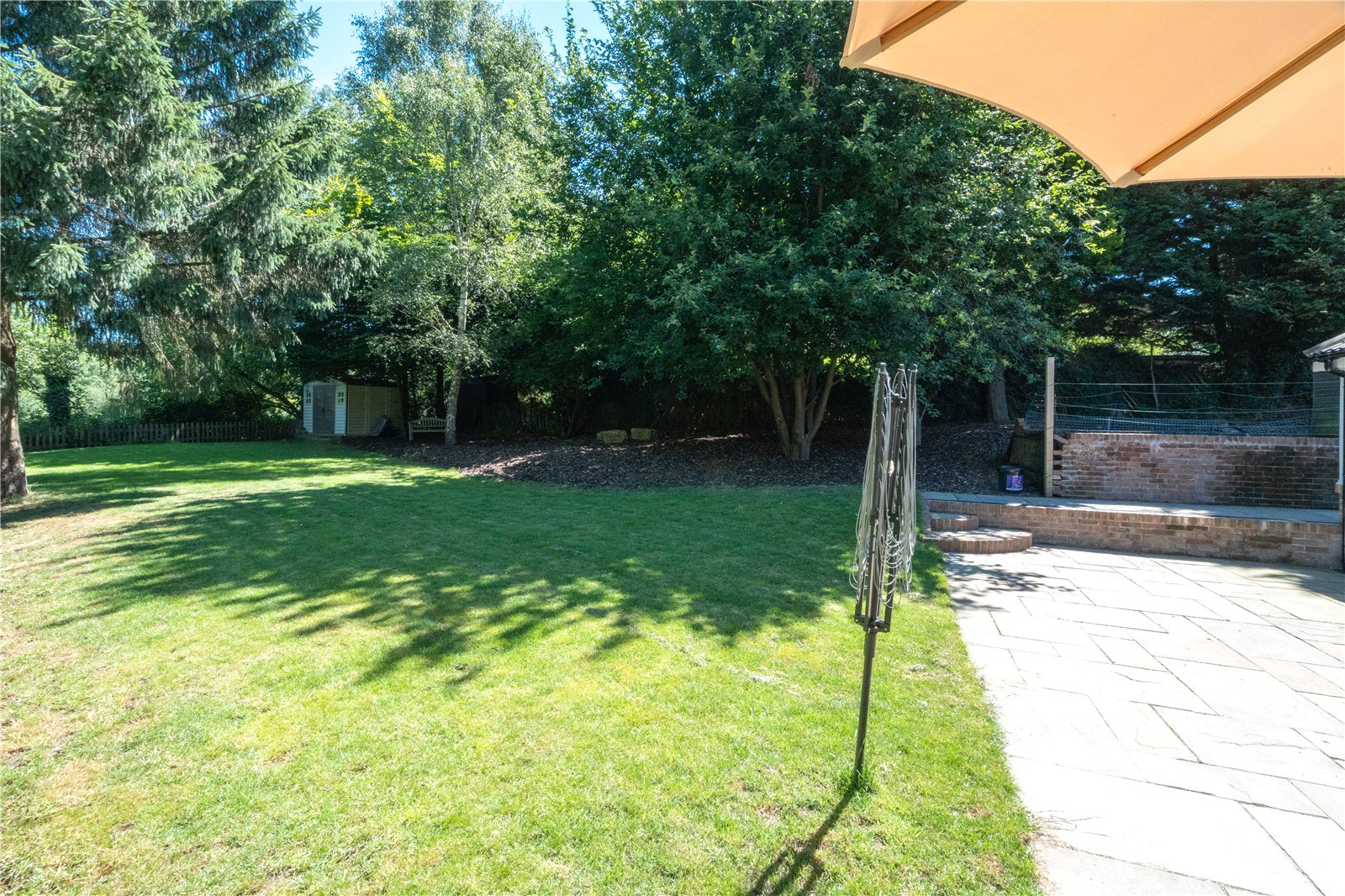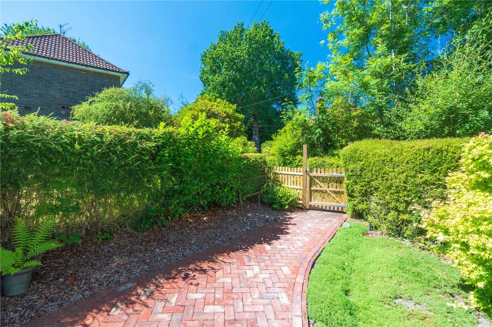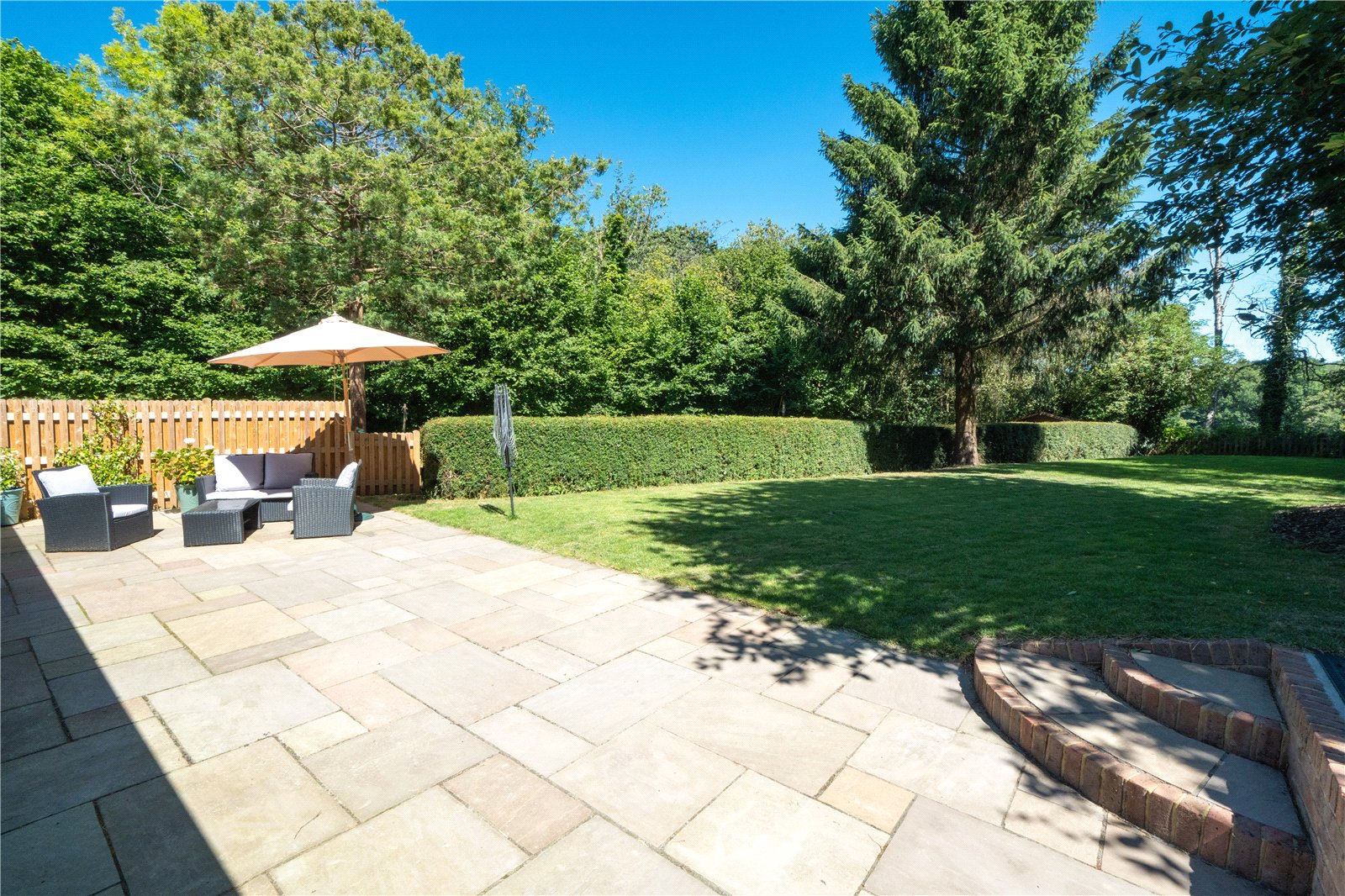 GARDEN/OUTSIDE AREA: The rear garden is an outstanding feature of the property, offering an expansive, secluded outdoor space ideal for family living and entertaining. A wide sandstone patio flows directly from the house and provides multiple seating and dining zones, currently arranged with stylish rattan garden furniture beneath a parasol. The level lawn beyond is bordered by mature hedging and tall trees, ensuring total privacy and a lush green backdrop. At the far end of the garden sits a charming timber summerhouse, tucked under the shade of established trees—perfect as a retreat or children's playhouse. Gated access leads to a brick-paved pathway bordered by hedges, leading around to the front of the house, where a pretty entrance with a pitched porch and cottage-style front door completes the welcoming exterior.
