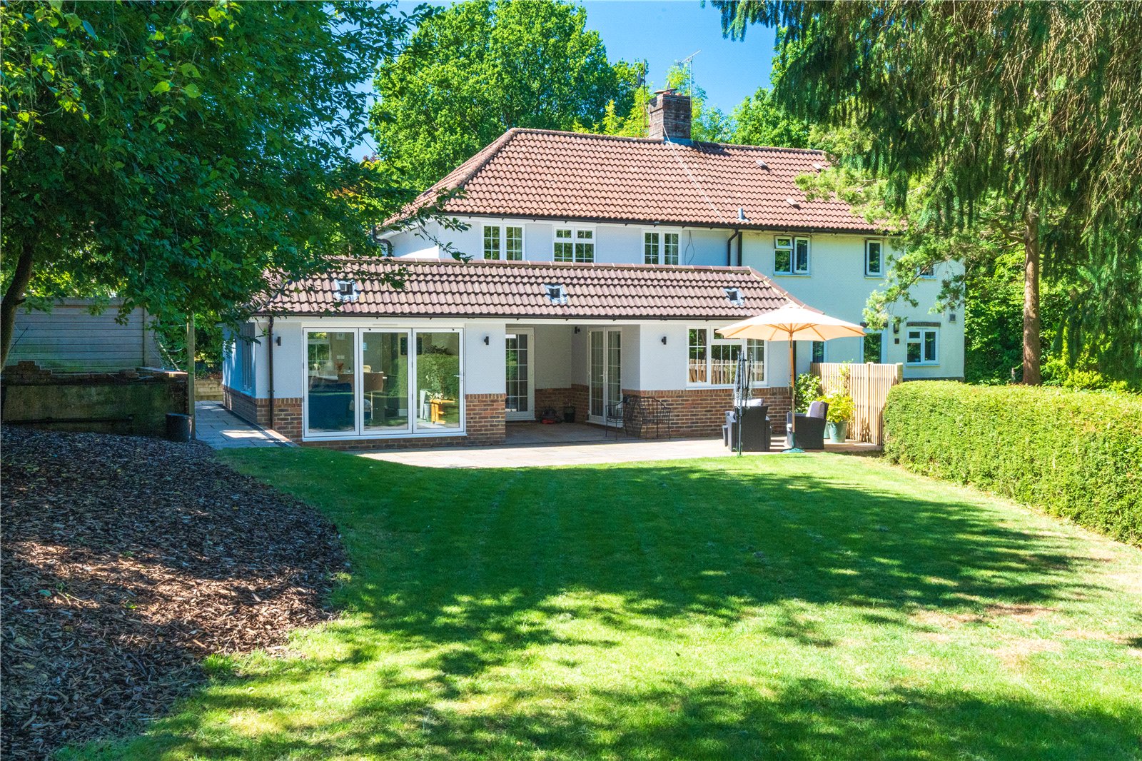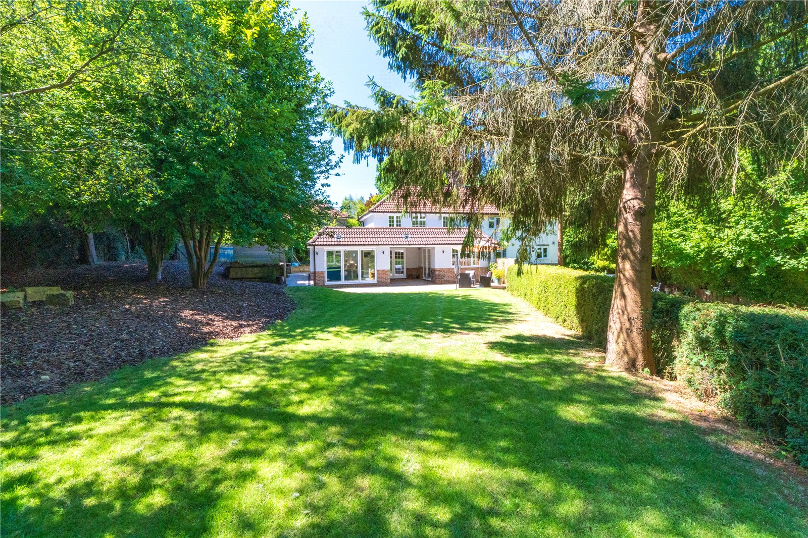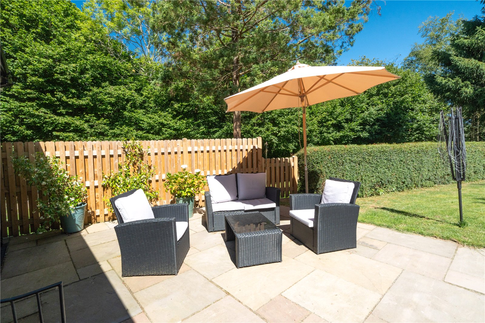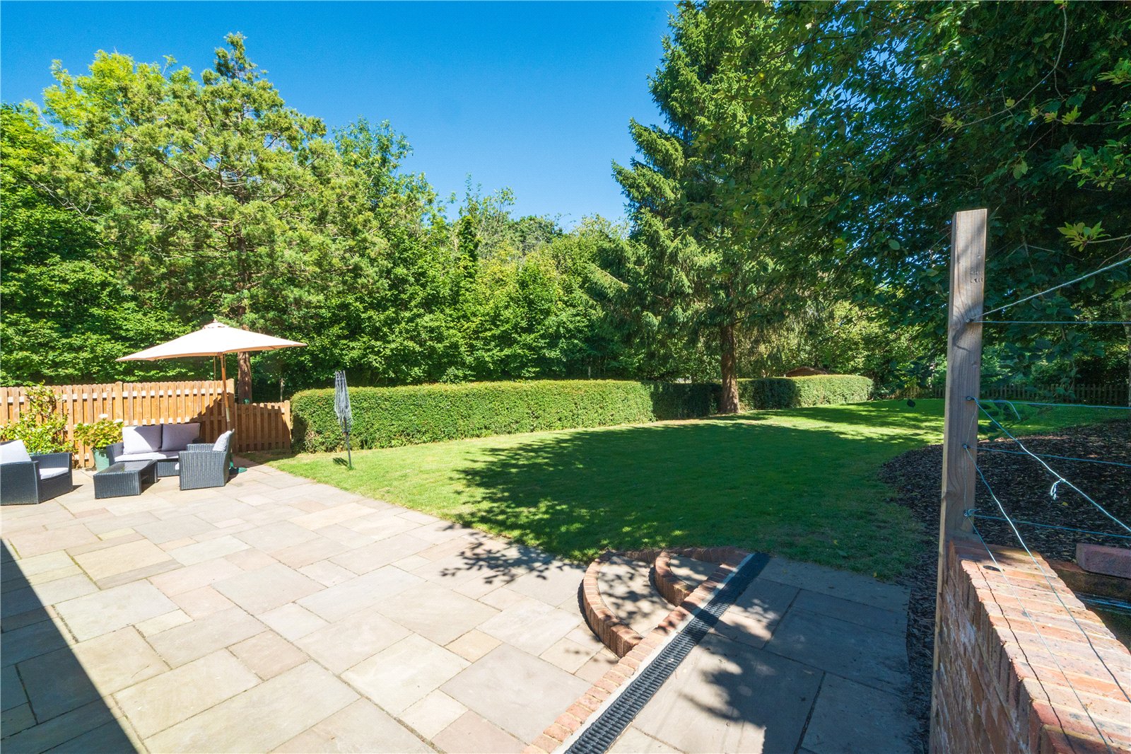 GARDEN/OUTSIDE AREA: The rear garden is an outstanding feature of the property, offering an expansive, secluded outdoor space ideal for family living and entertaining. A wide sandstone patio flows directly from the house and provides multiple seating and dining zones, currently arranged with stylish rattan garden furniture beneath a parasol. The level lawn beyond is bordered by mature hedging and tall trees, ensuring total privacy and a lush green backdrop. At the far end of the garden sits a charming timber summerhouse, tucked under the shade of established trees—perfect as a retreat or children's playhouse. Gated access leads to a brick-paved pathway bordered by hedges, leading around to the front of the house, where a pretty entrance with a pitched porch and cottage-style front door completes the welcoming exterior.