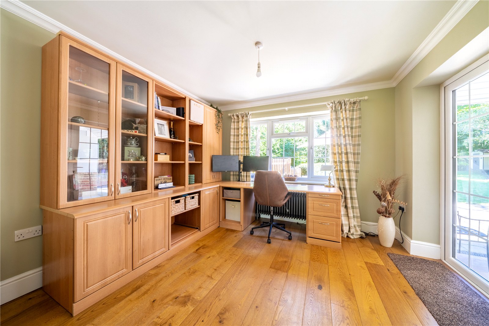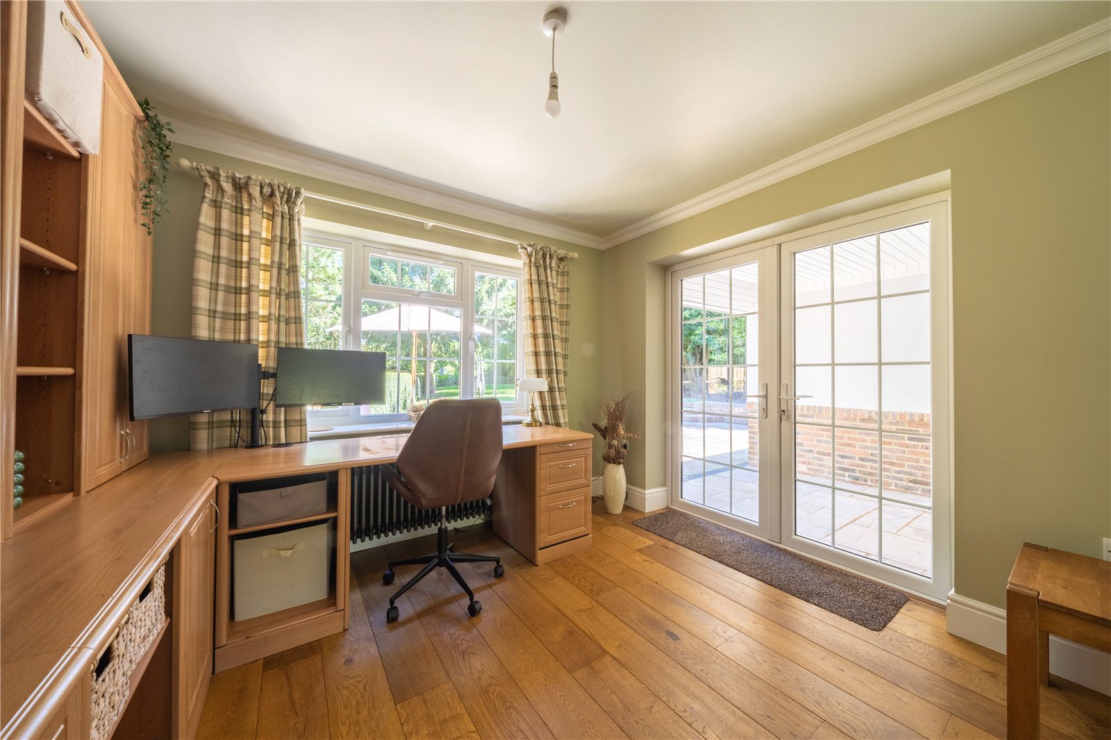 STUDY: This bright and well-appointed study is the ideal space for home working or creative pursuits. Fitted with bespoke wooden cabinetry offering extensive shelving, cupboard storage, and integrated desk space, the room is both functional and stylish. A large window to the rear enjoys an open view of the garden, while glazed double doors provide direct access to the patio — flooding the room with natural light throughout the day. The continuation of the wide oak flooring and neutral colour palette creates a seamless connection with the adjoining sitting room, lending a sense of flow and cohesion.