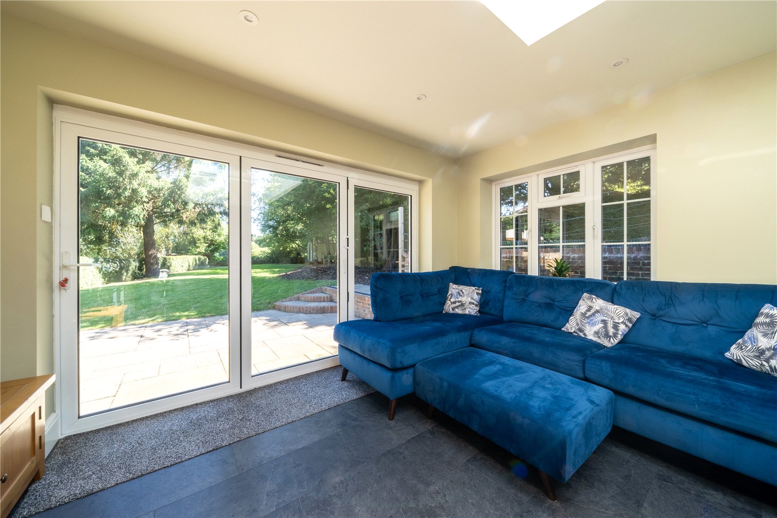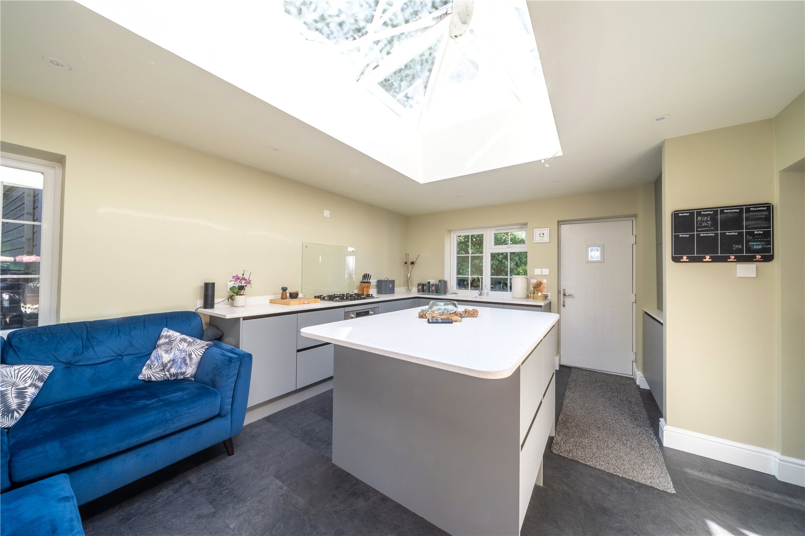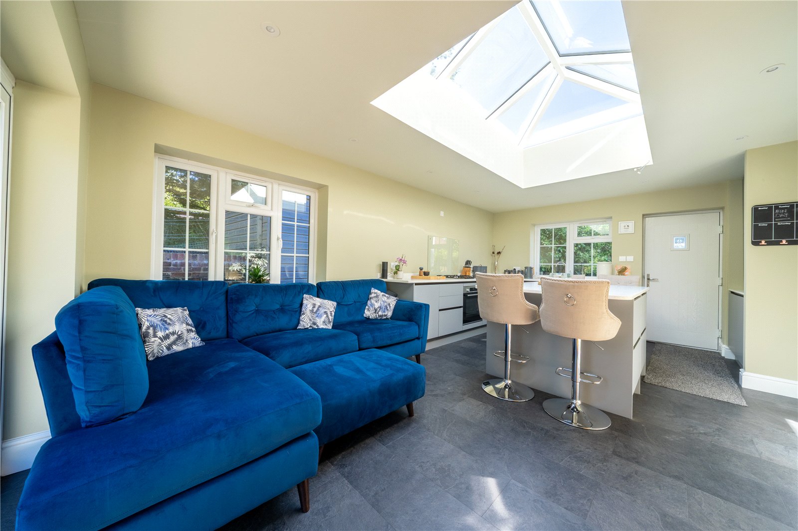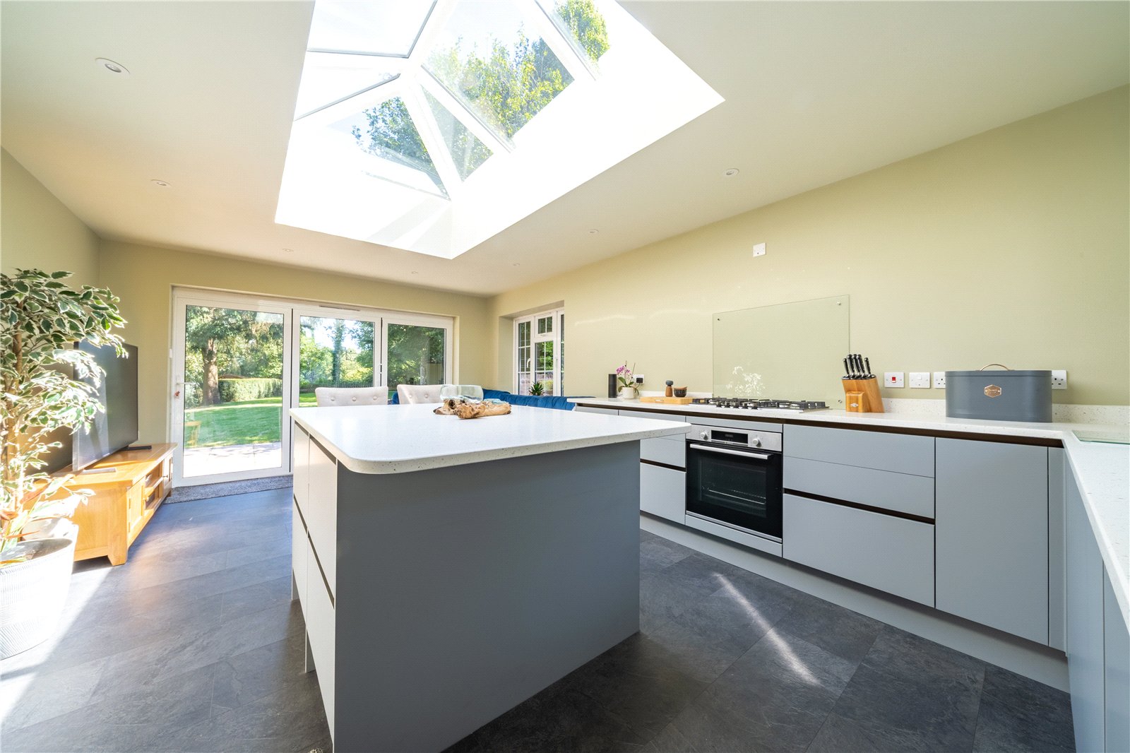 To one end, a comfortable seating area provides the perfect spot to relax or entertain guests, while full-height bi-folding doors open out onto the garden, seamlessly connecting indoor and outdoor living. The modern layout, clean finishes, and tranquil garden views combine to make this space the natural hub of the home.