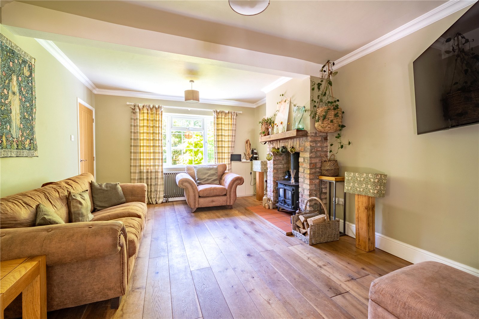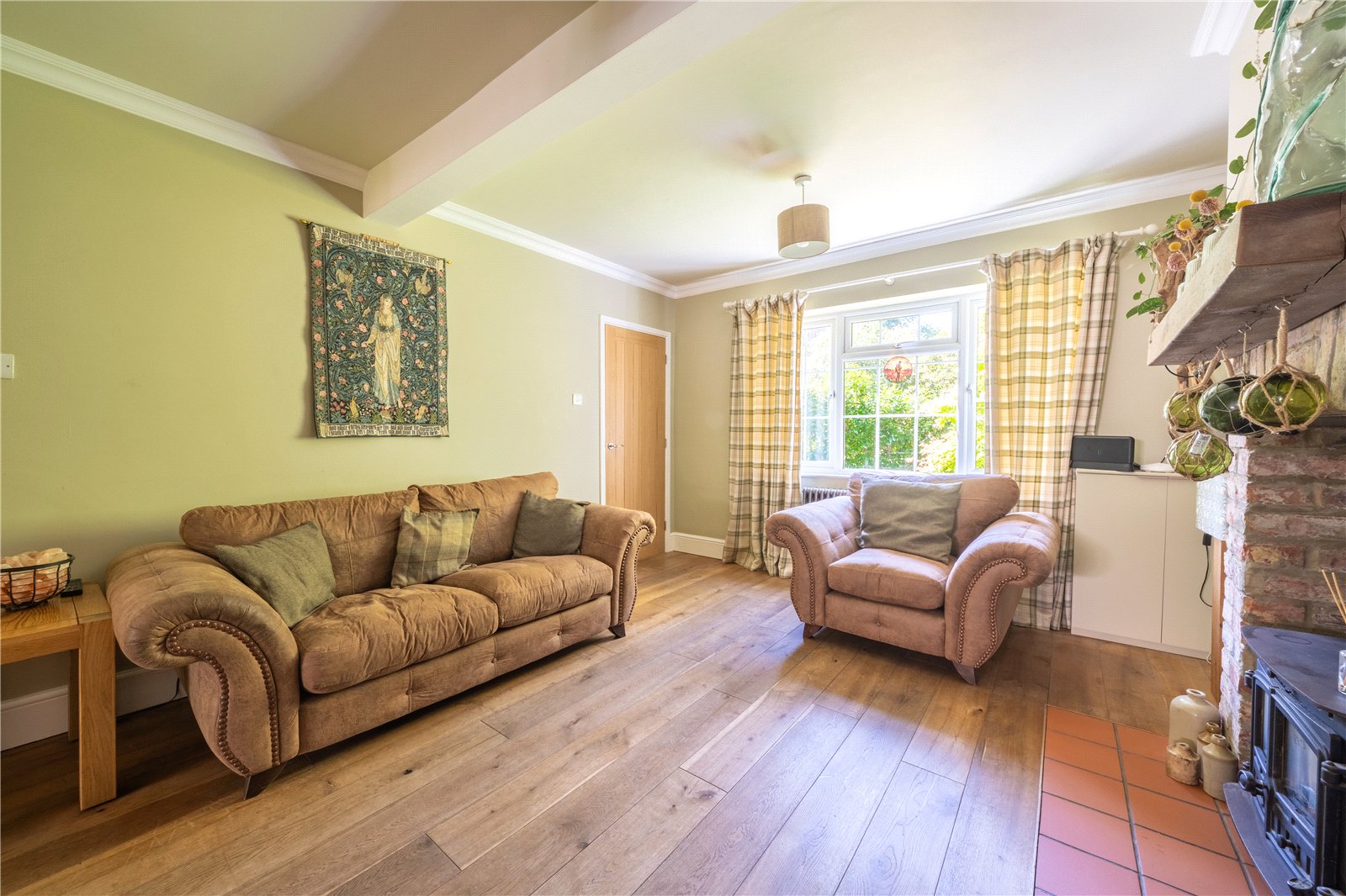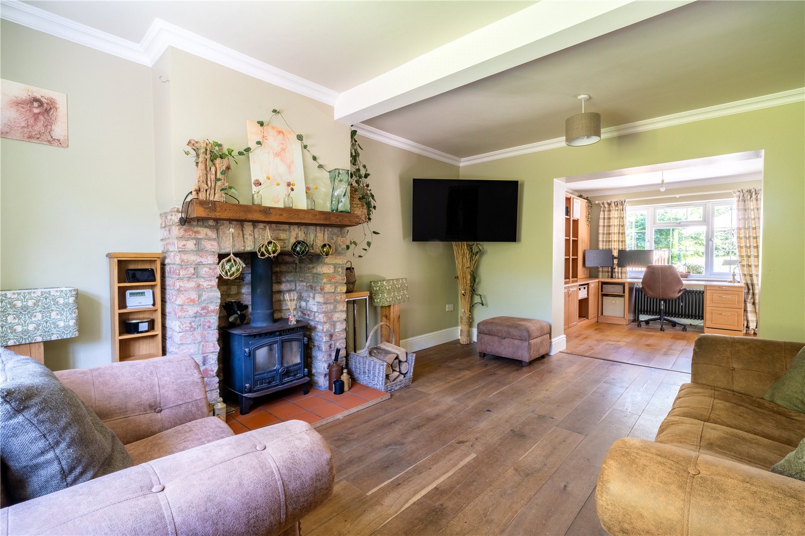 SITTING ROOM: This beautifully presented sitting room offers a warm and inviting atmosphere, perfect for both relaxing and entertaining. A charming exposed brick fireplace with a wood-burning stove serves as a striking focal point, complemented by a rustic timber mantel and decorative accents. The space is bathed in natural light from dual-aspect windows dressed with classic check curtains, while wide-plank wooden flooring adds character and continuity throughout. Soft, earthy tones on the walls create a calm and cosy backdrop, further enhanced by plush seating and tasteful finishes. The room flows seamlessly into a practical home office area, offering both comfort and functionality in a wonderfully homely setting.
