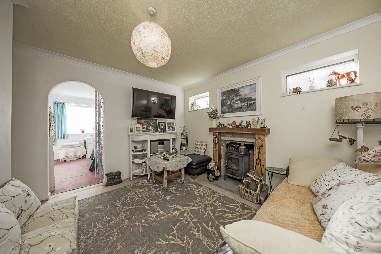 LIVING AREA: Feature fireplace with wood bressumer surround, inset brick hearth and flagstone hearth, fitted carpet, radiator and two high level windows.