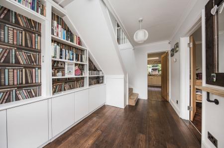 ENTRANCE HALL: Built-in bookcase with secret door opening to a self contained ground floor annexe, stairs to first floor, wood laminate flooring, radiator and floor to ceiling window to front.