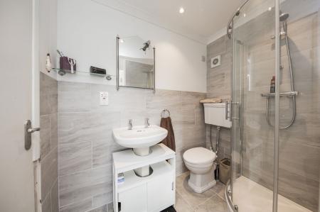 SHOWER ROOM: Shower cubicle with integrated shower, wc, pedestal wash hand basin, wc and tiled flooring.
