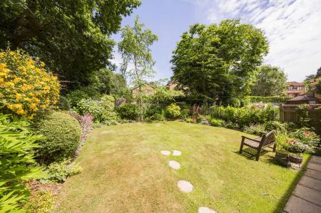 OUTSIDE REAR: The garden is beautifully maintained with an area laid to lawn having well stocked mature flower bed borders and mature trees and shrubs with a small running stream to the rear. Small rockery and a paved patio,