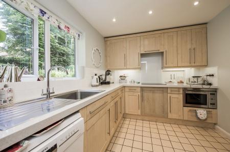 KITCHEN: Fitted with a range of high and low level units with lighting underneath and a tiled splashback, granite roll top work surfaces. 'Hotpoint' ceramic hob with extractor fan above. Tall high level fan assisted oven with grill along with a fitted microwave. Stainless steel sink with swan mixer tap. 'Siemens' dishwasher. Tiled flooring, recessed LED spotlights. Window overlooking the rear garden with a fitted blind. A square opening leads through to: