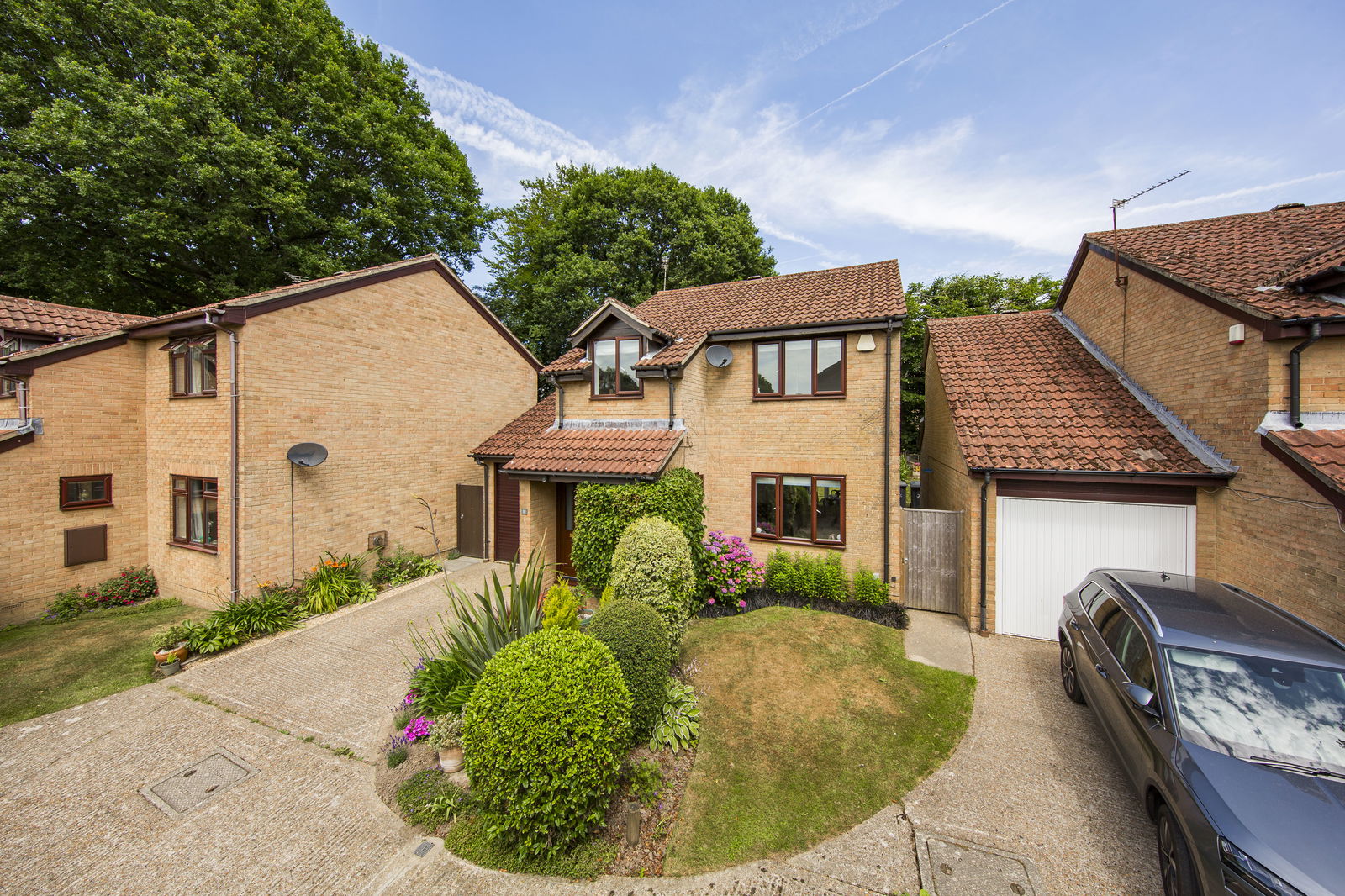 OUTSIDE FRONT: The garden has an area laid to lawn with attractive flower bed borders with mature trees and shrubs and mature plants. An attractive climbing Hydrangea adorns the front facade.