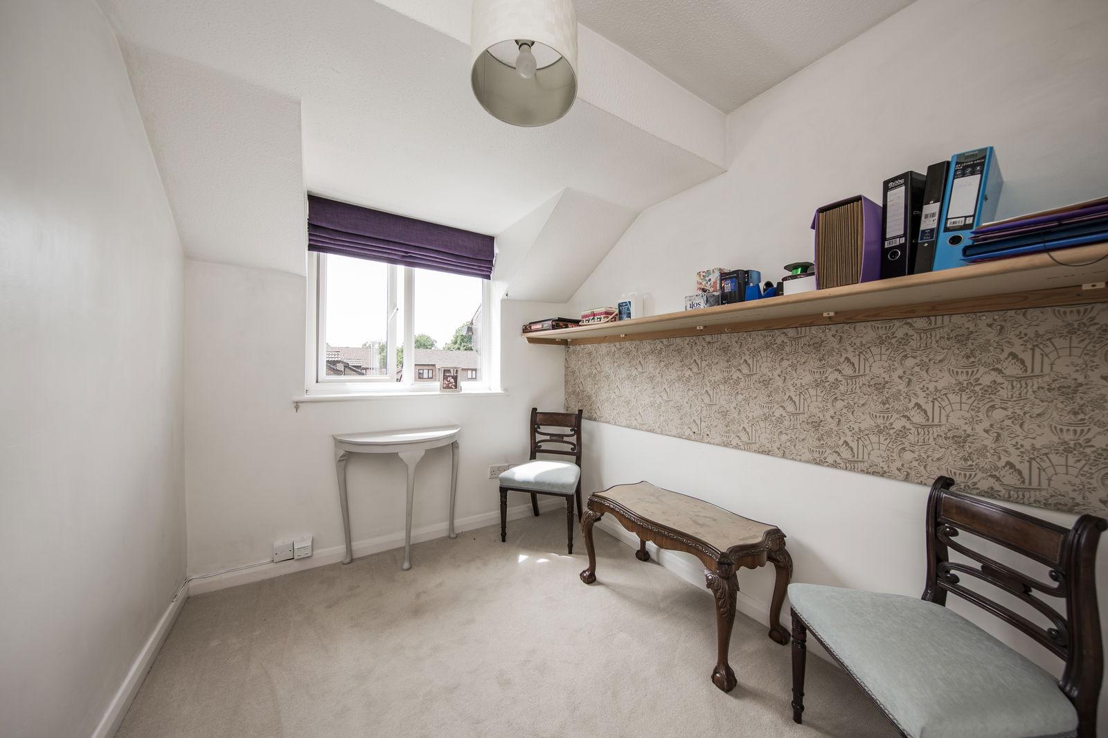 BEDROOM: Fitted carpet, radiator. Door into a good sized walk-in eaves storage. Window to the rear with fitted blind offering attractive views.