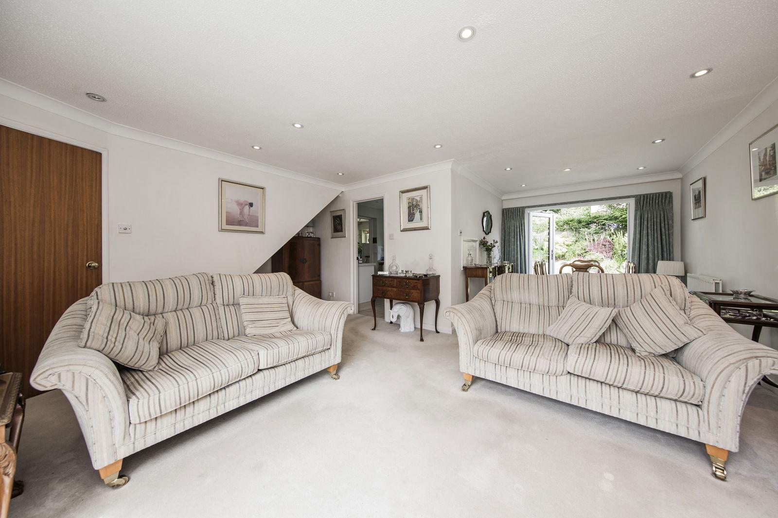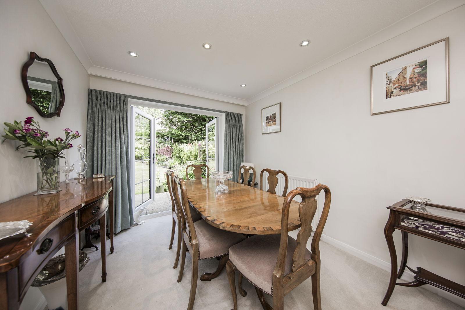 'L' SHAPED SITTING/DINING ROOM: Bright and airy with recently fitted carpet, two radiators, recessed LED spotlights. Double aspect with window to the front with fitted blind overlooking the front garden and recently installed crittall double glazed French doors leading to the patio and garden beyond.