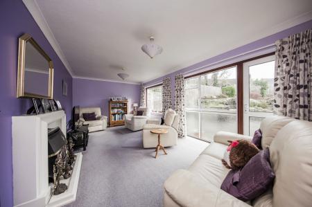 SITTING ROOM: Attractive painted stone fireplace incorporating a gas fire insert (not tested) with mantle and hearth, fitted carpet, two radiators, wall to wall windows with aspect over rear garden and door opening to a rear patio and garden beyond.