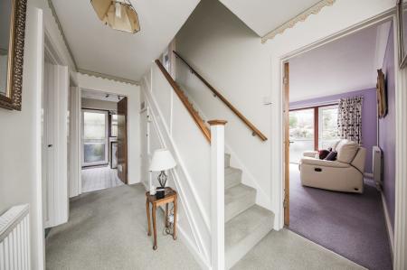 ENTRANCE HALL: Understairs cupboard housing the thermostat, alarm system and shelving area. Additional cupboard housing the electric consumer unit along with gas and electric meters. Fitted carpet and a smoke alarm.