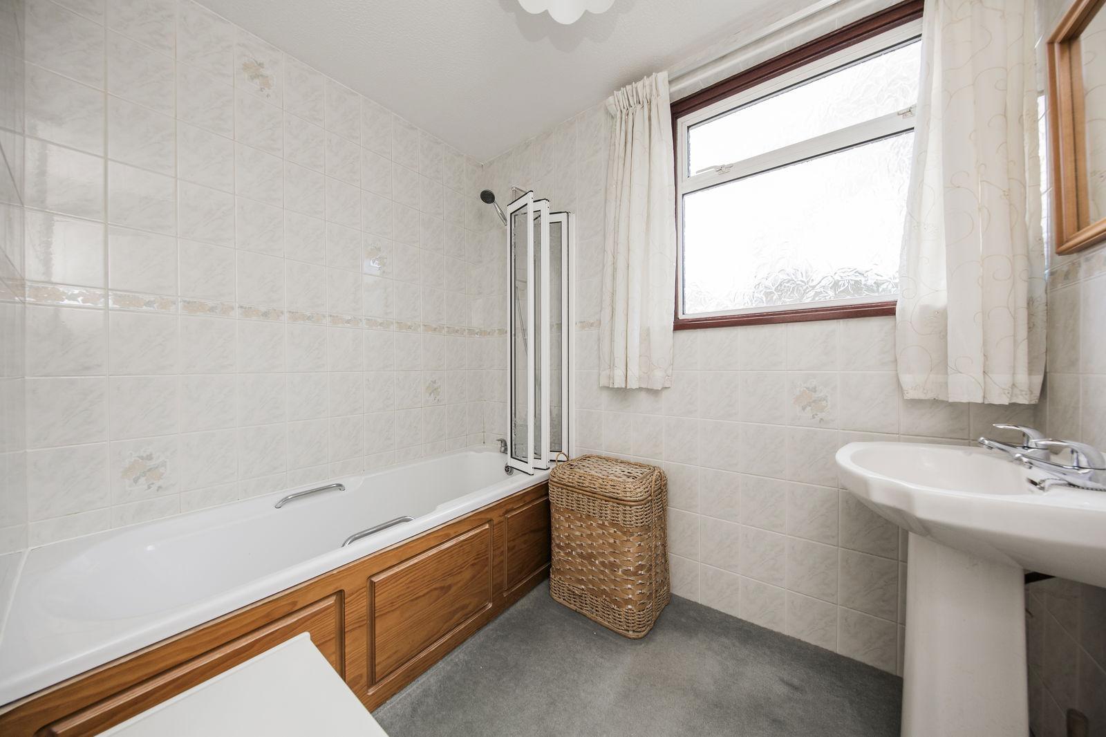 FAMILY BATHROOM: Panelled bath with wall mounted shower, mixer taps and bifold shower screen, pedestal wash hand basin, fitted carpet, radiator, fully tiled walling and obscured window to side.