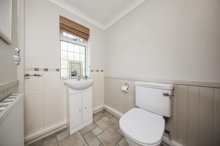 CLOAKROOM: Dual flush low level wc, vanity wash hand basin, chrome heated towel rail, tiled flooring, dado rails, half panelled walling and obscured window to front.