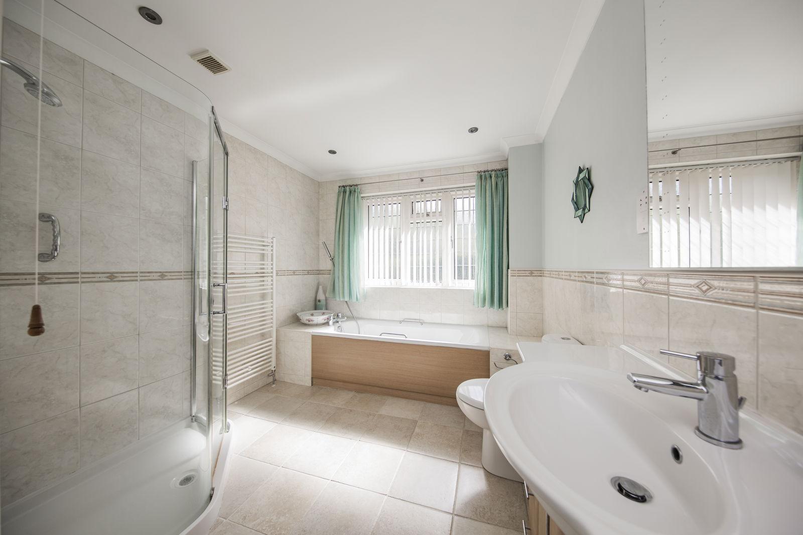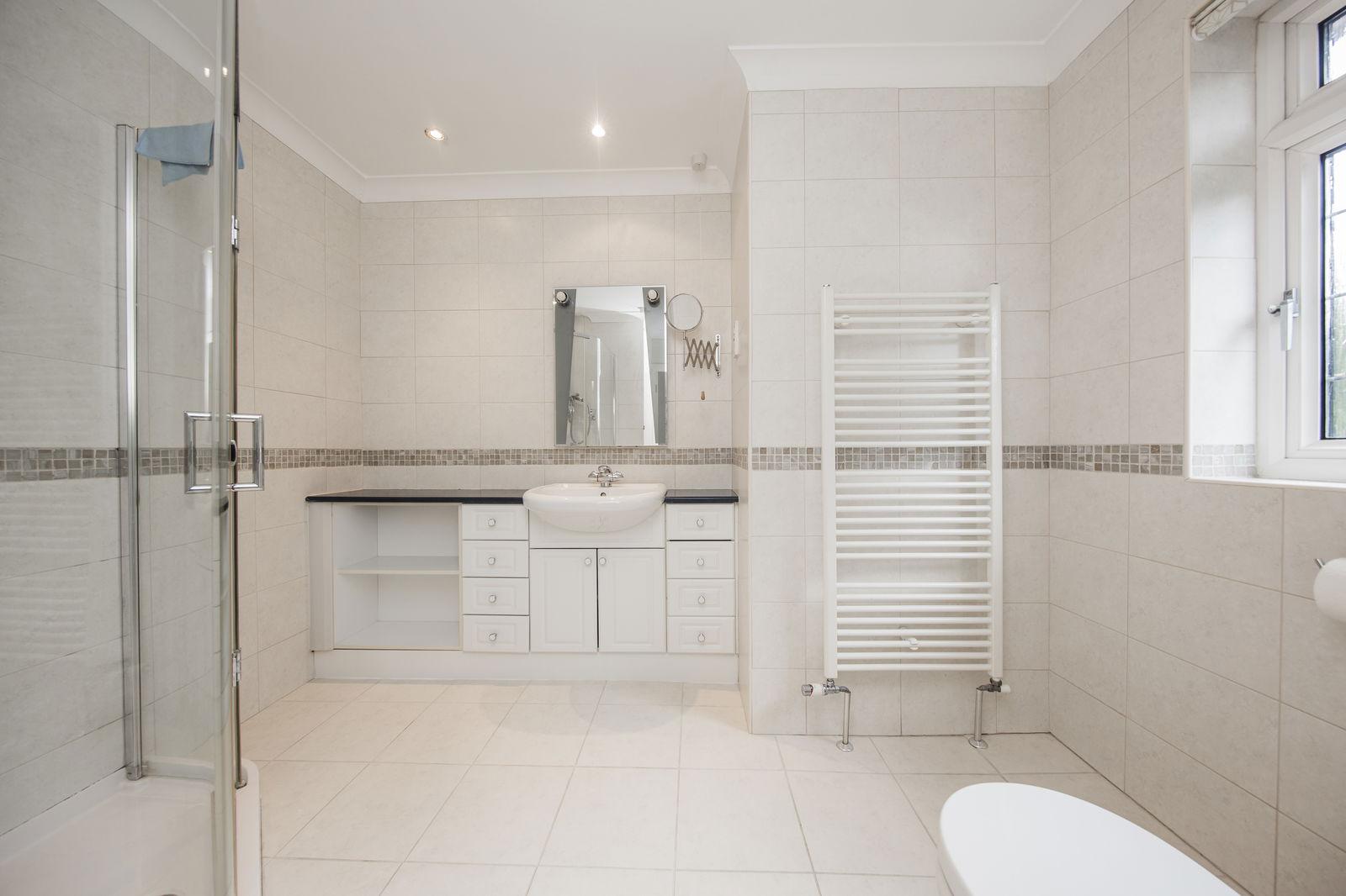 FAMILY BATHROOM: Enclosed tiled cubicle with Aqualisa thermostatic shower, panelled bath with shower attachment over, dual flush low level wc and vanity wash hand basin with storage below. Cupboard housing Potterton gas boiler and pressurised water system, heated towel rail, mirrored wall and obscured window to front.