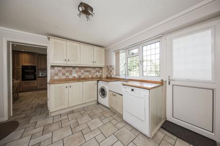 UTILITY ROOM: Range of wall and base units with wooden worktops over incorporating an inset Butler sink with swan mixer tap. Space for washing machine and tumble dryer, radiator, tiled flooring, large window and door to rear garden.