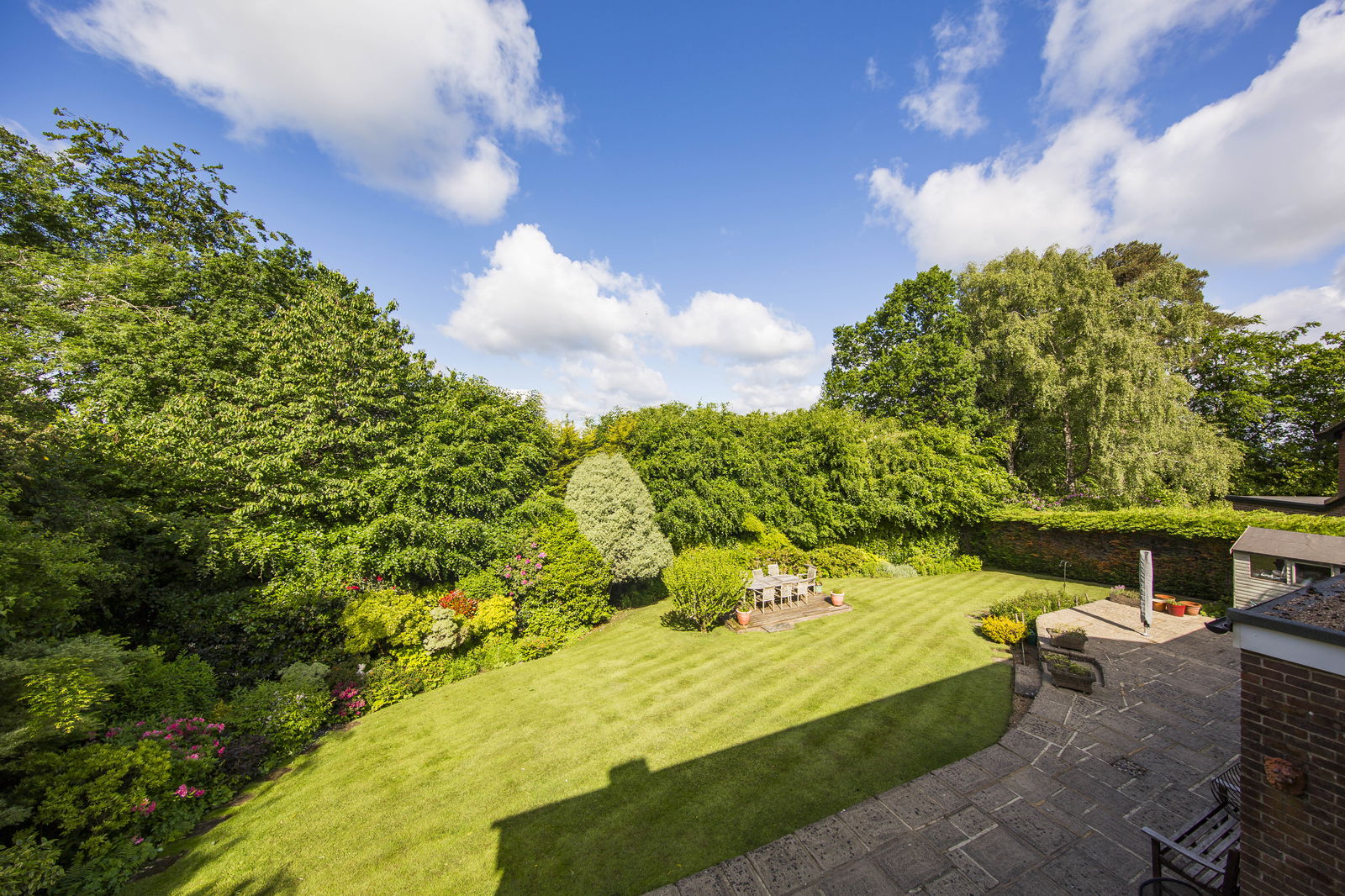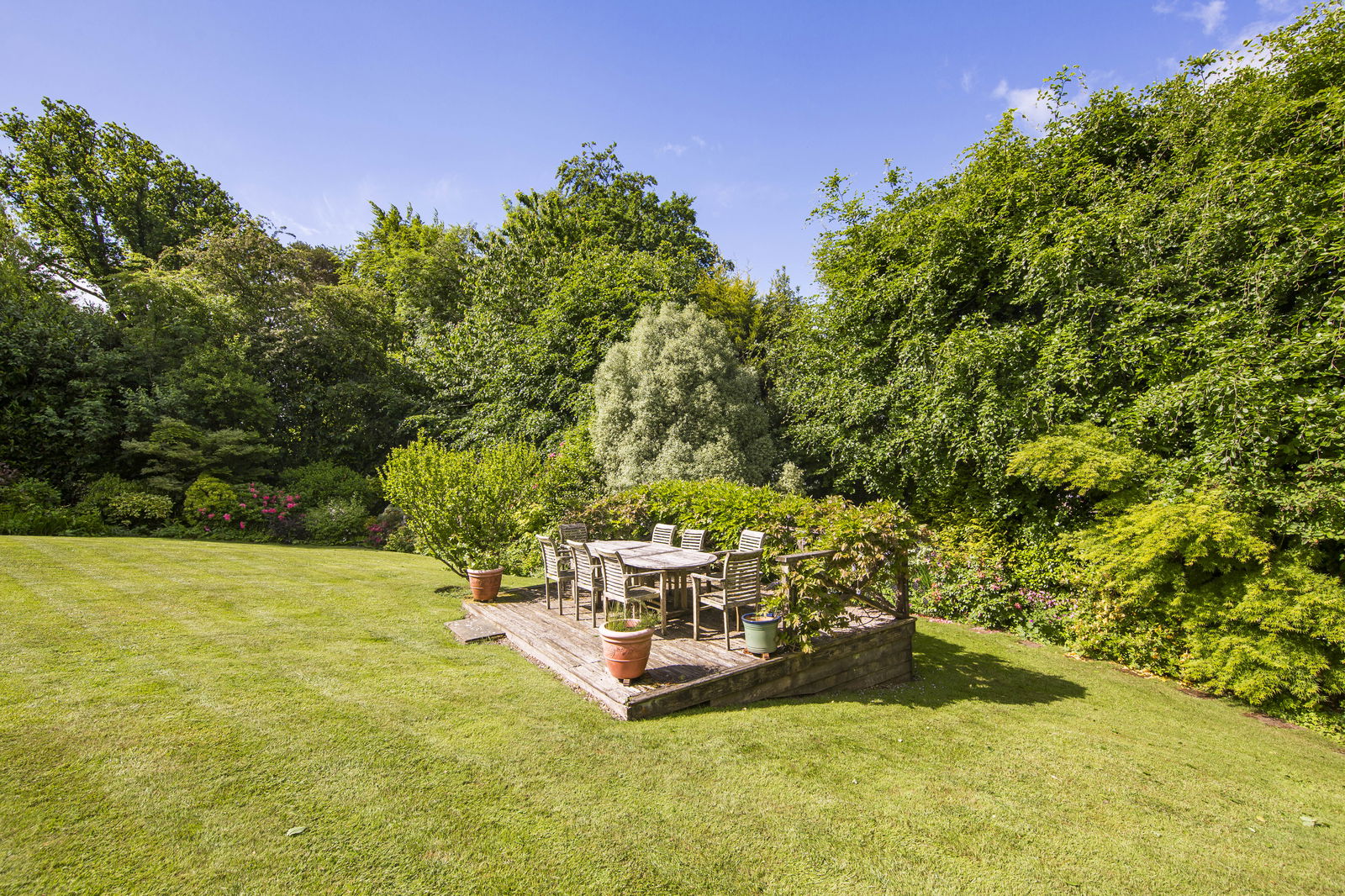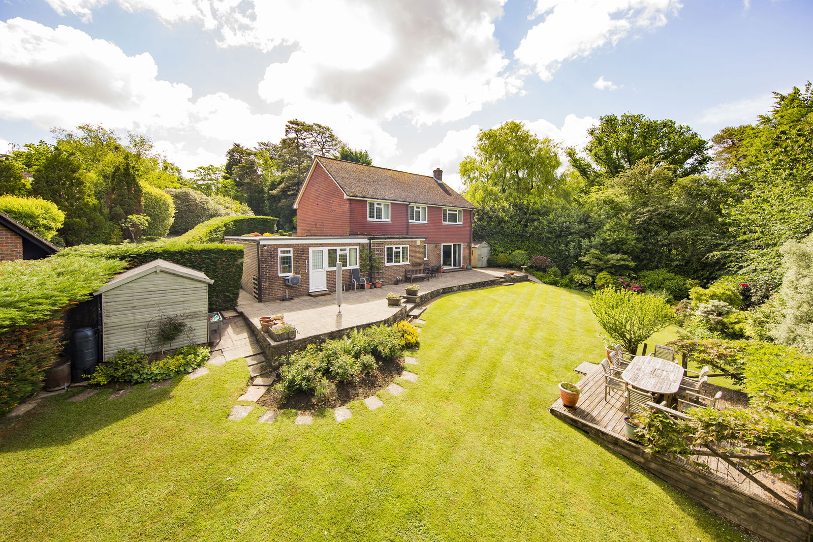 OUTSIDE REAR: Providing a great deal of seclusion and privacy and benefiting from a westerly aspect the garden features a large patio adjacent to the property. There is a good area of lawn with a wide range of planting to include an abundance of Acers and Rhodendrons and a timber shed.