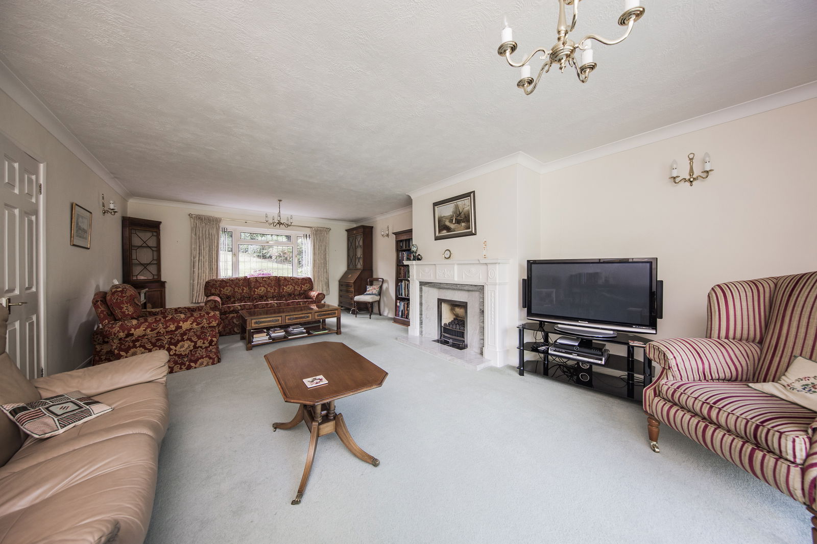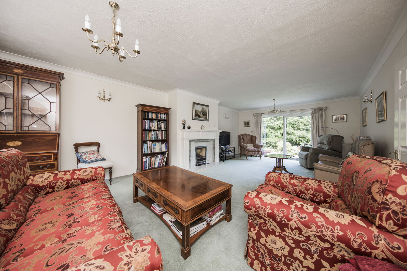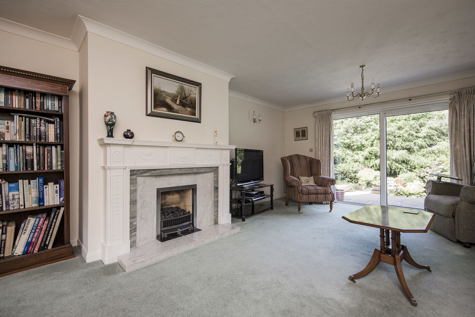 SITTING ROOM: Feature fireplace incorporating inset flame effect gas fire with wood mantle, ornate surrounds and hearth. Three radiators, fitted carpet, wall lighting, large window to front and sliding doors opening to rear garden.