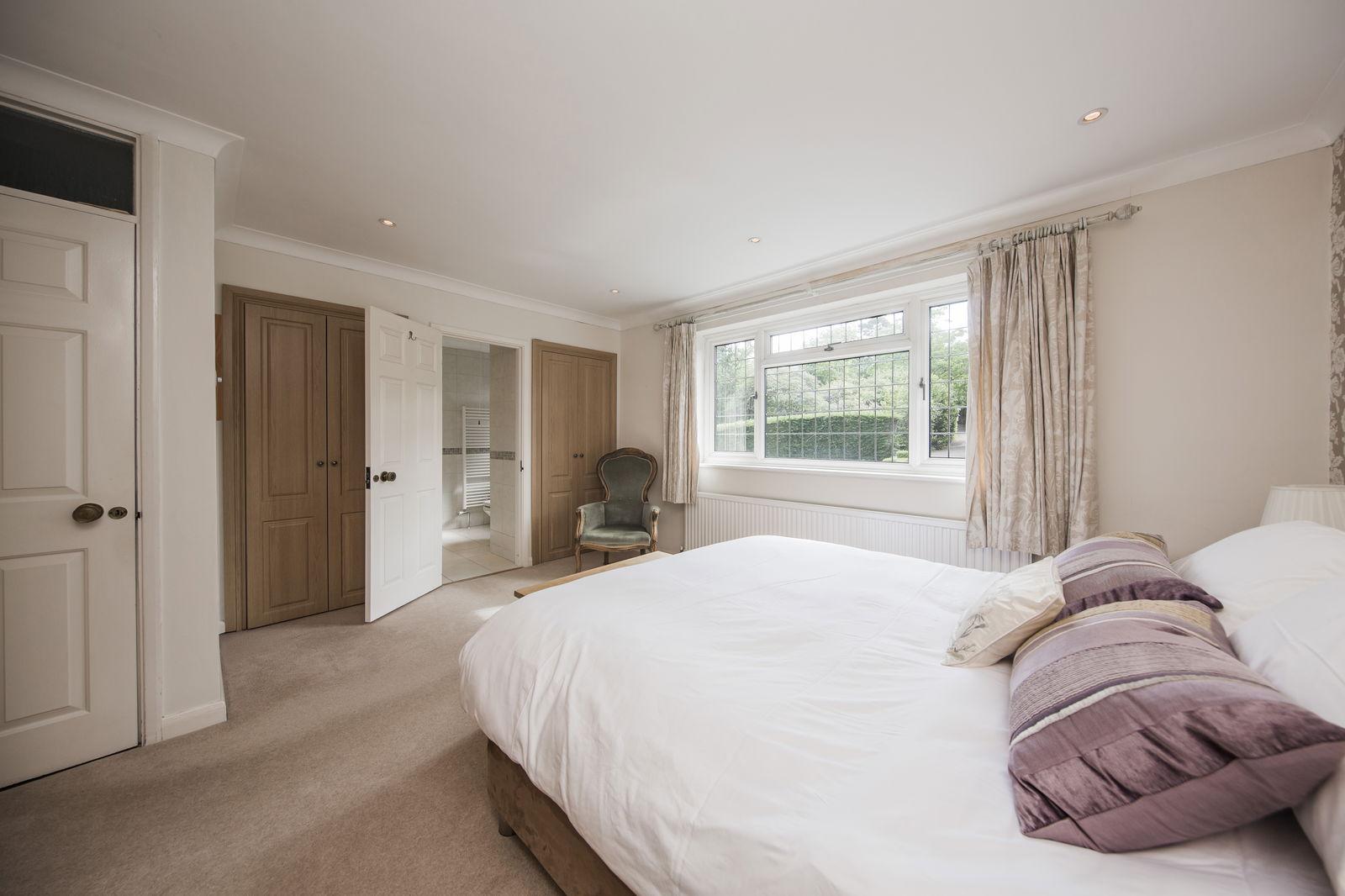 MAIN BEDROOM: Extensive wardrobe cupboards, radiator, fitted carpet, window to front and door into: